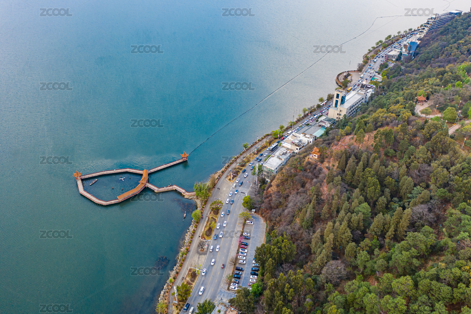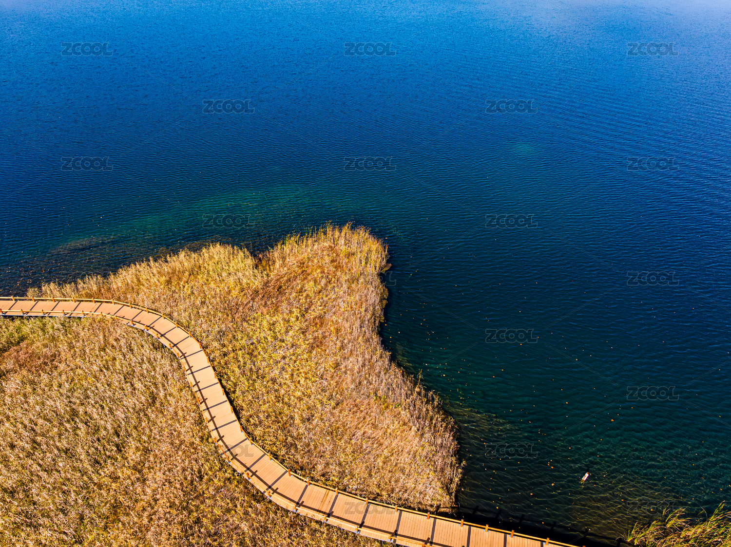 航拍云南大理洱海湖滨观景平台木栈道步道