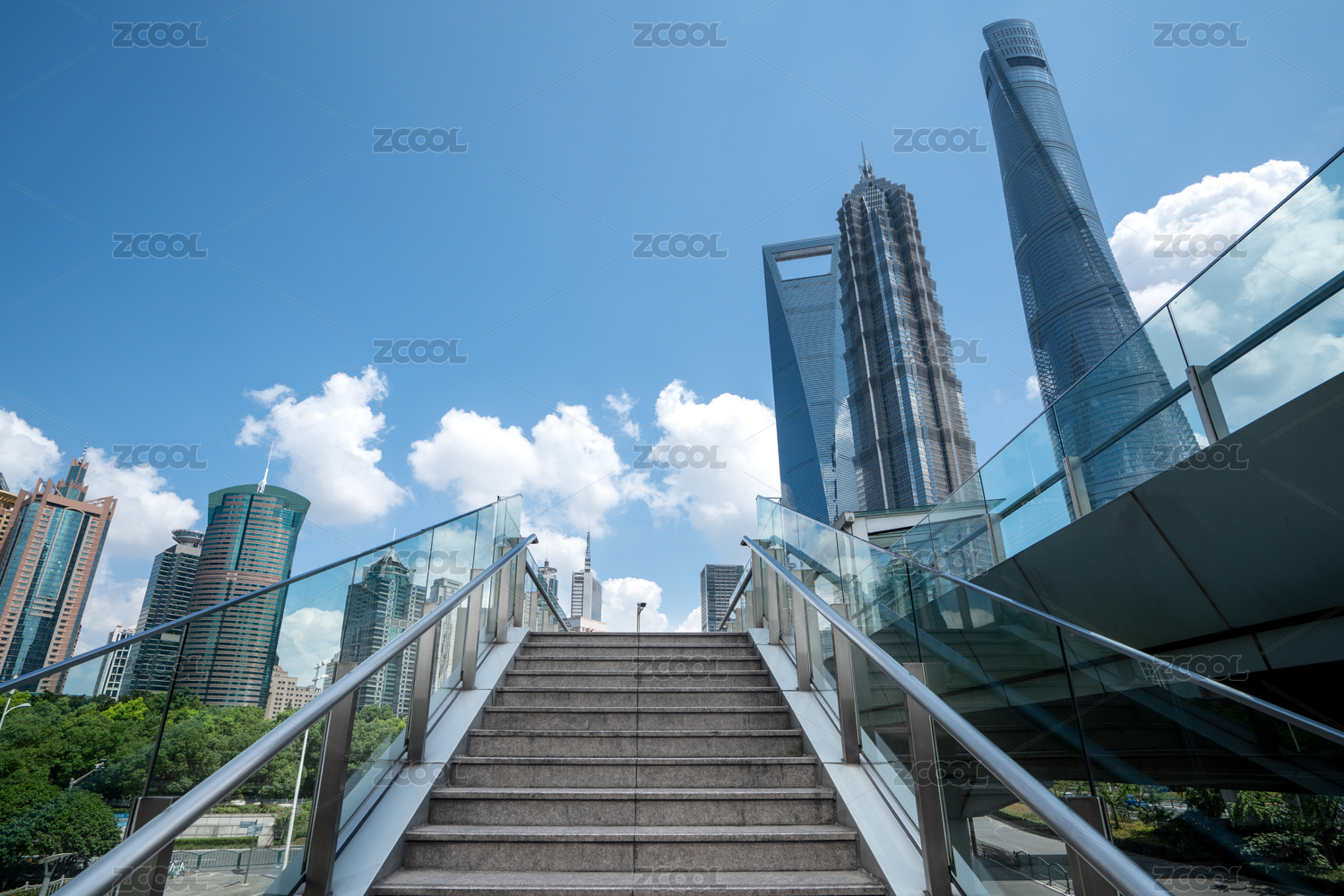在楼梯上拍摄浦东摩天大楼