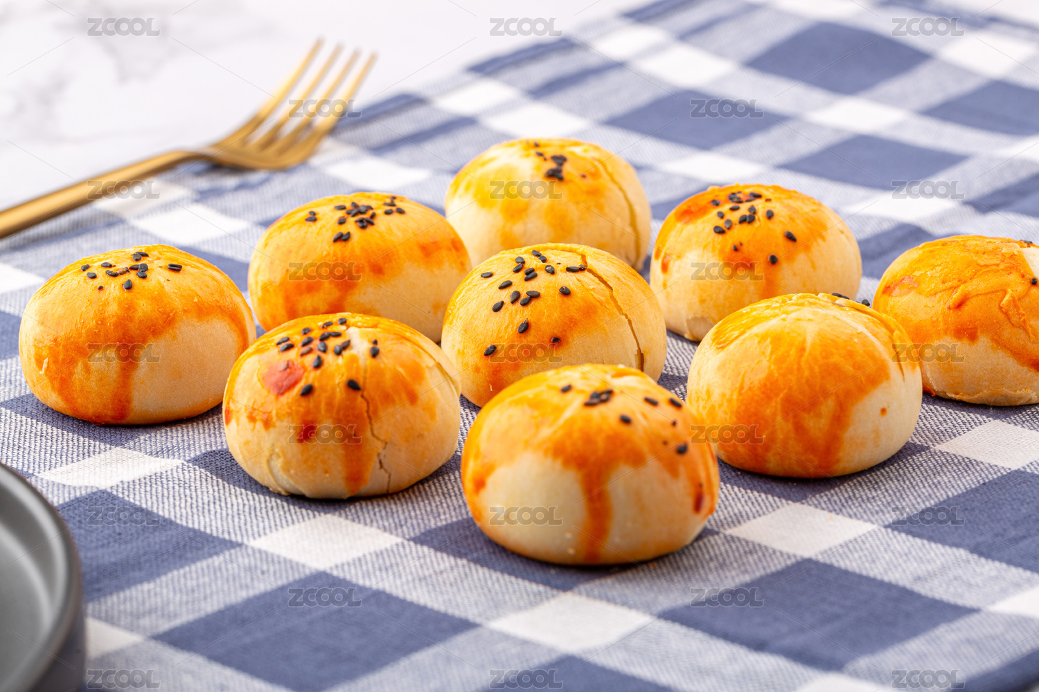 放在格子布上的蛋黄酥美味零食