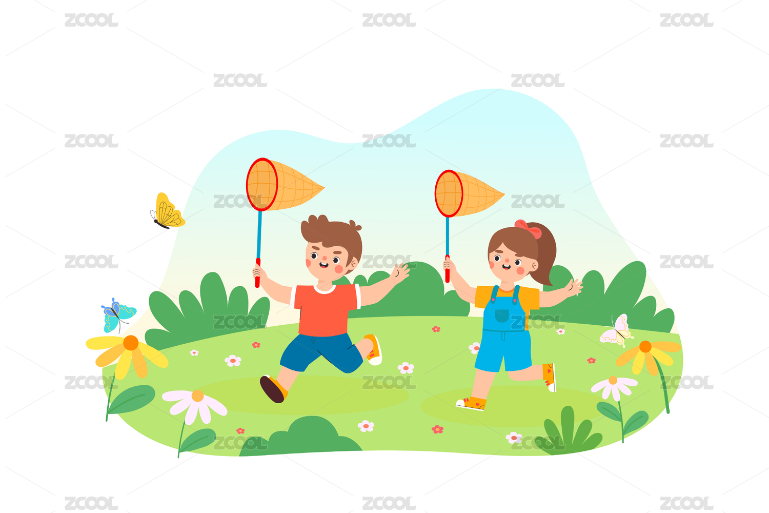 春天万物复苏小朋友捕蝴蝶矢量插画