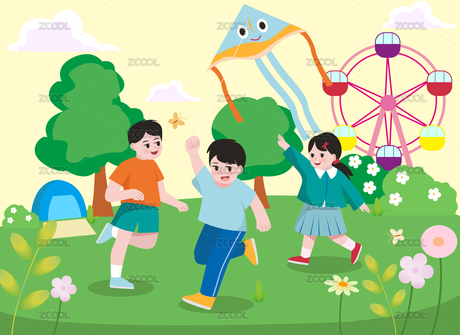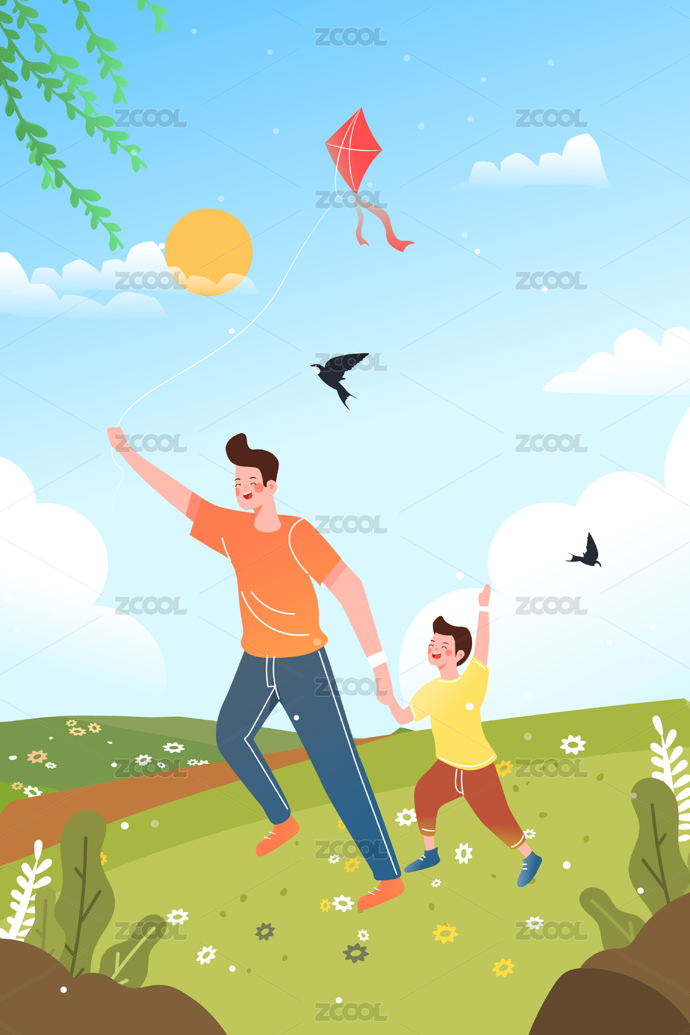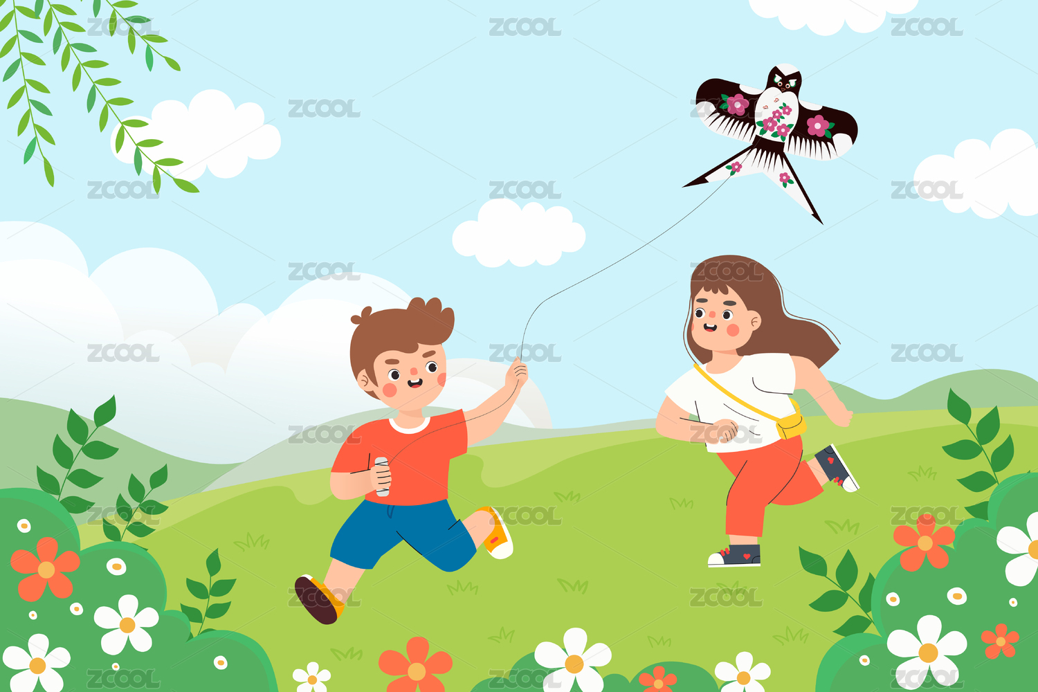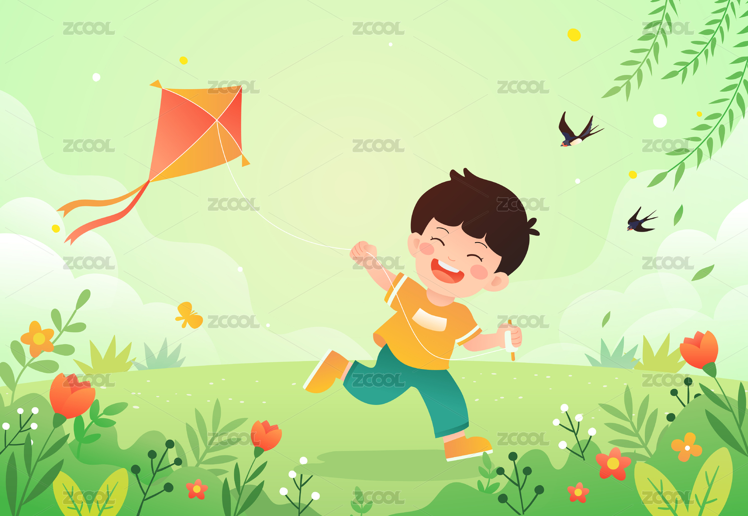 卡通立春放风筝出行踏青春季风景背景矢量插画