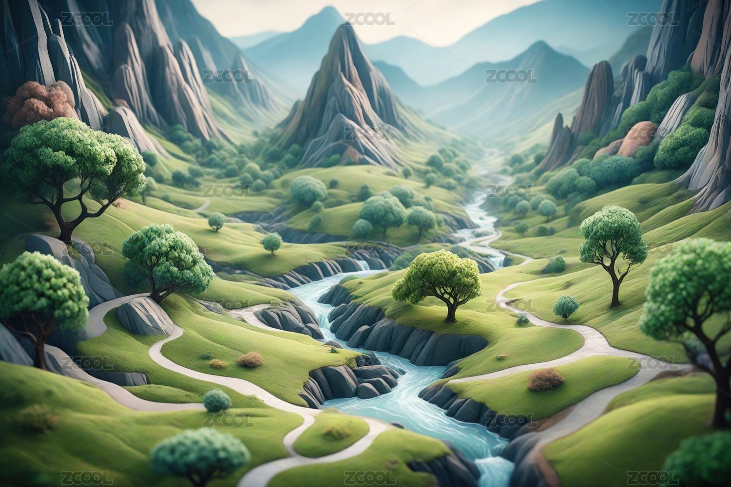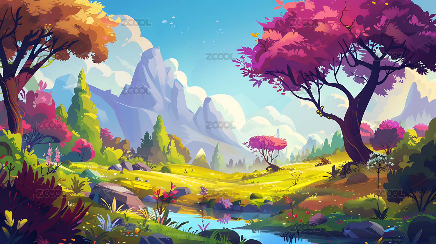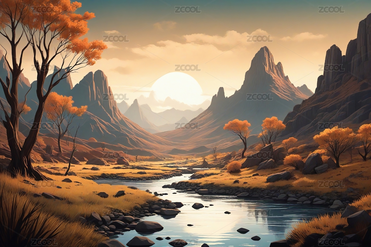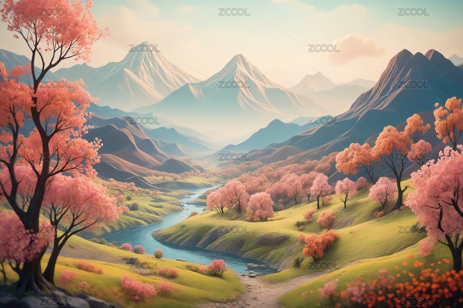 山,水流,树木,花朵,粉色,秋天,风景,画作,自然,山峰