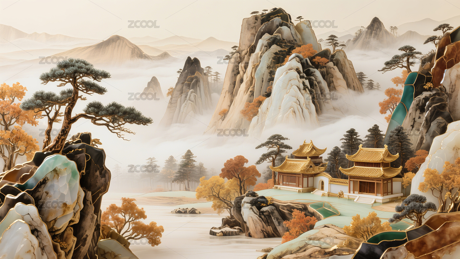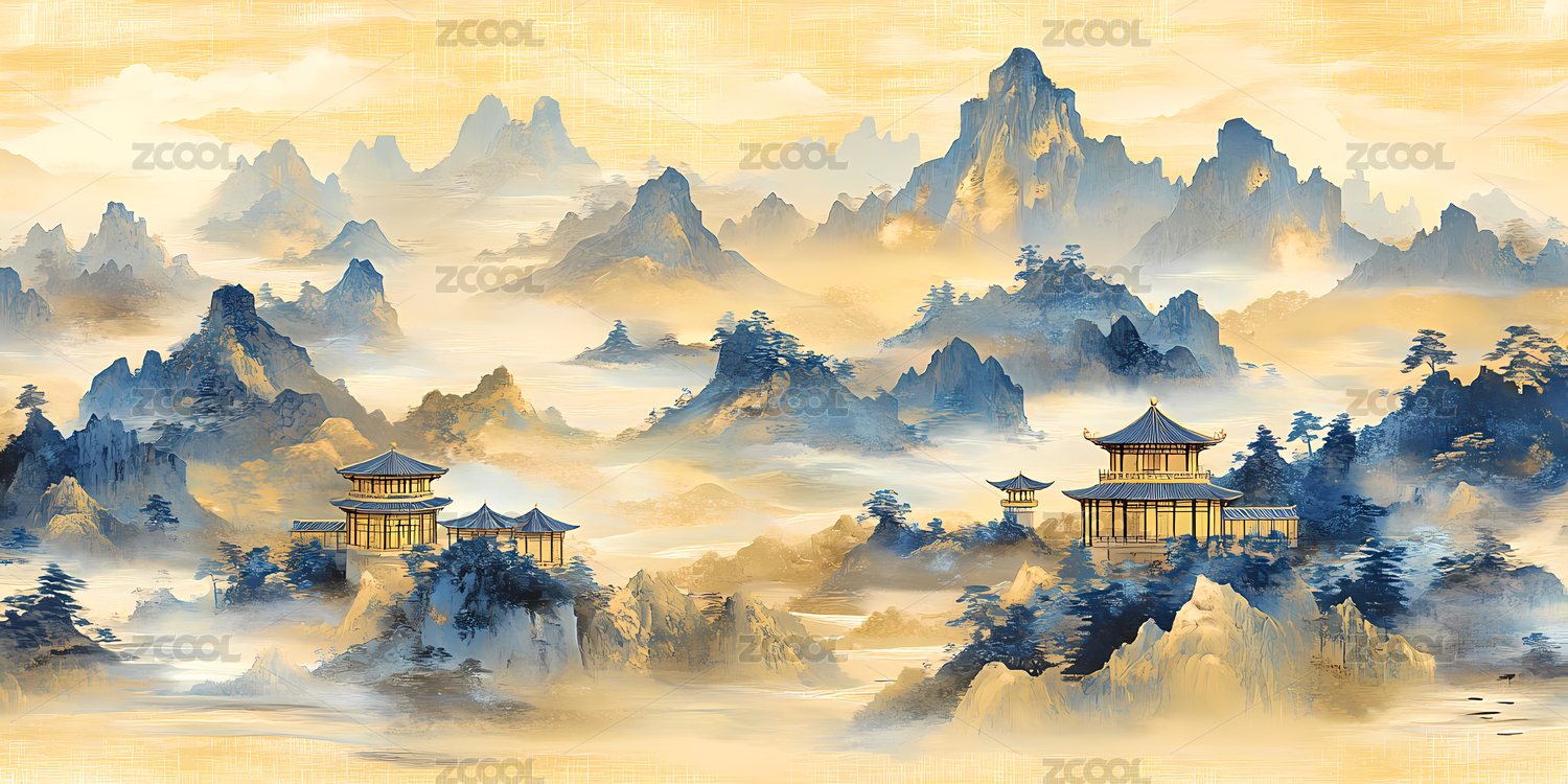 山水,宫殿,树木,云雾,青山,绿水,金黄,蓝色,屋顶,山峰
