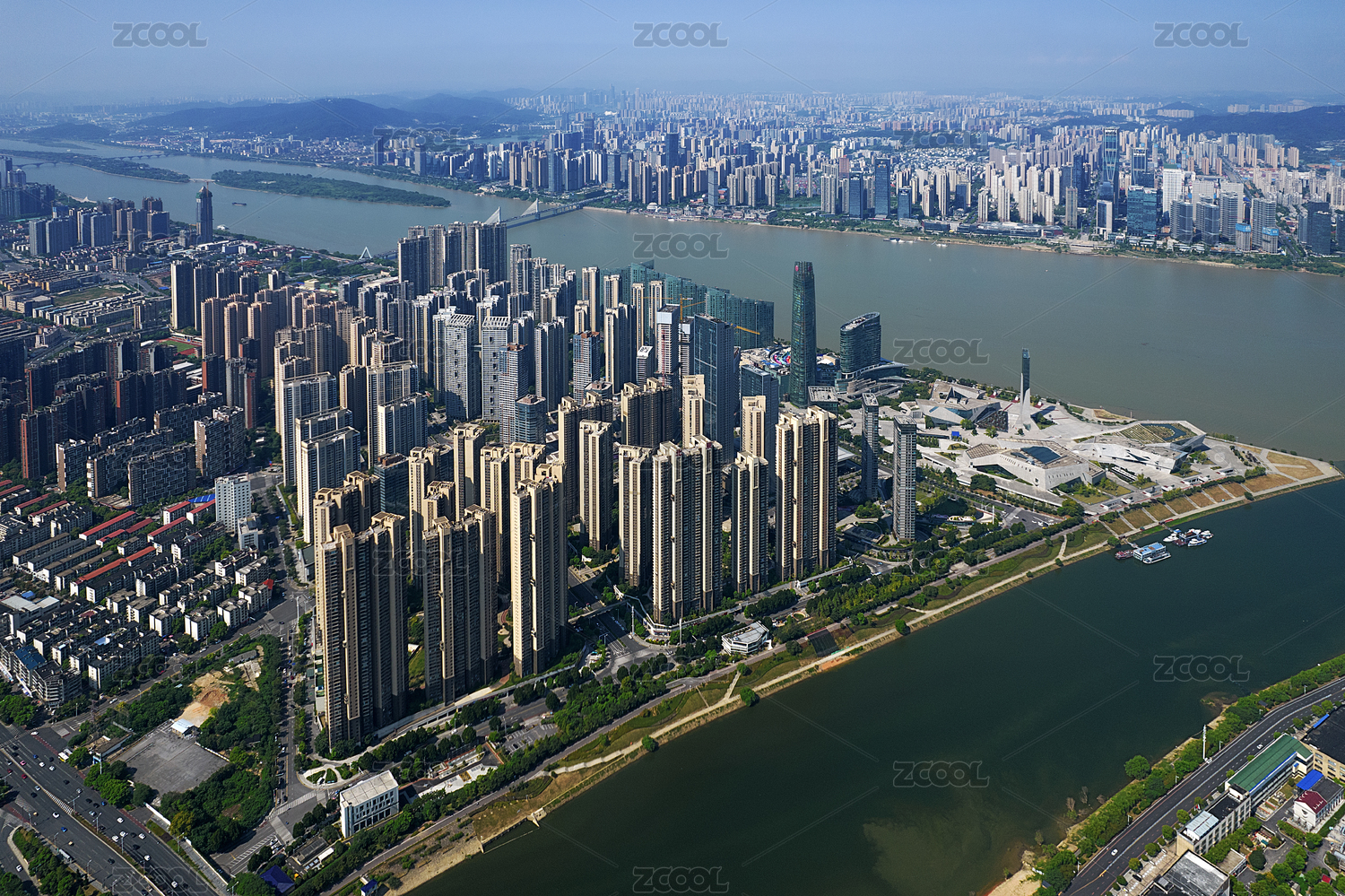 中国湖南长沙湘江北辰三角洲航拍城市风光