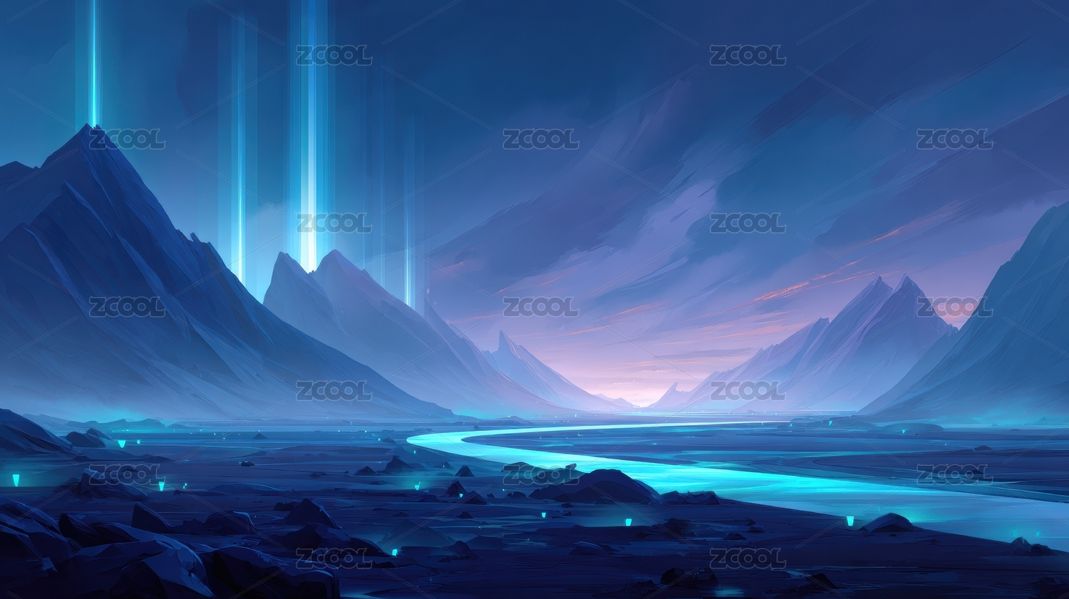 未来,城市,山脉,湖泊,反射,天空,光线,建筑,高楼,夕阳