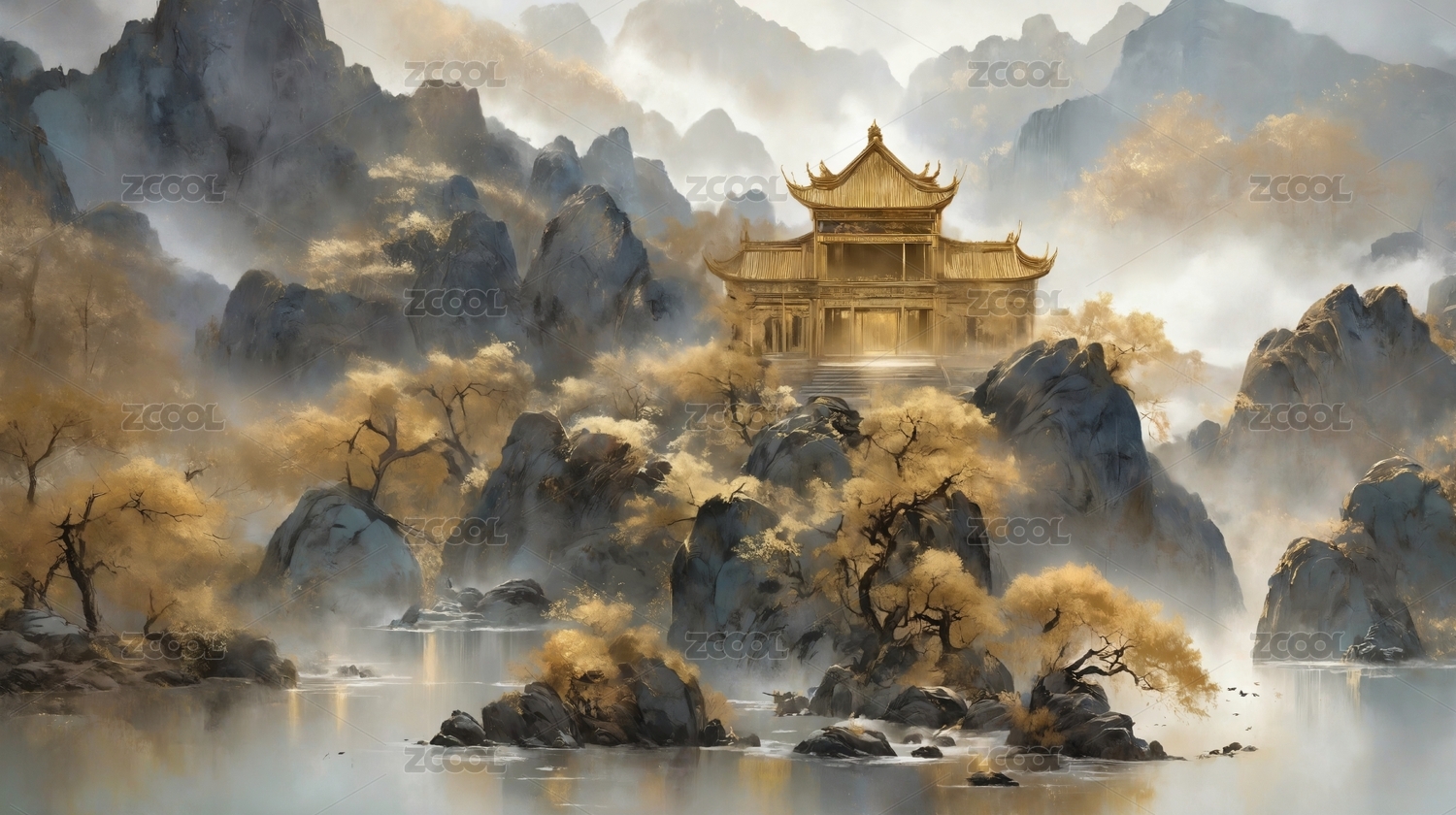 山水,建筑,传统,中国,风格,秋景,雾气,朦胧,山峦,树木