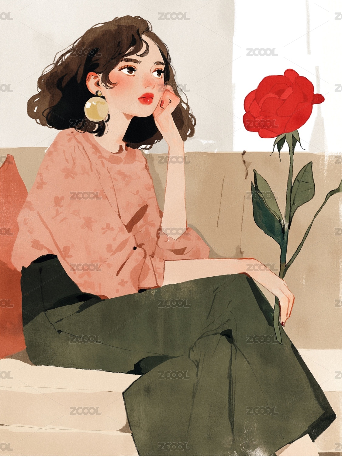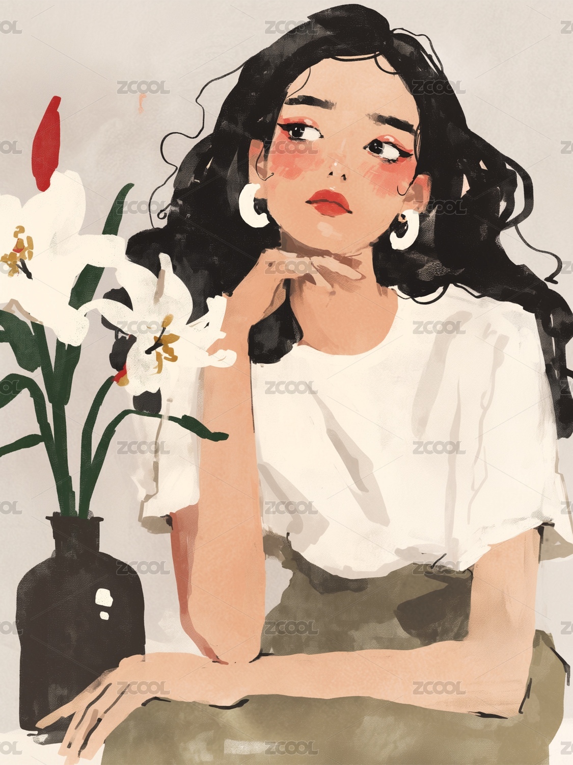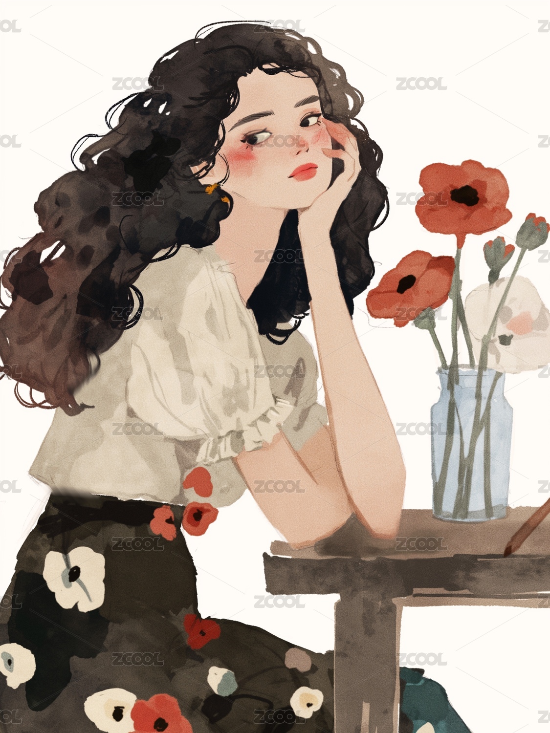 女生,松弛感,植物,鲜花,桌子,水彩,治愈