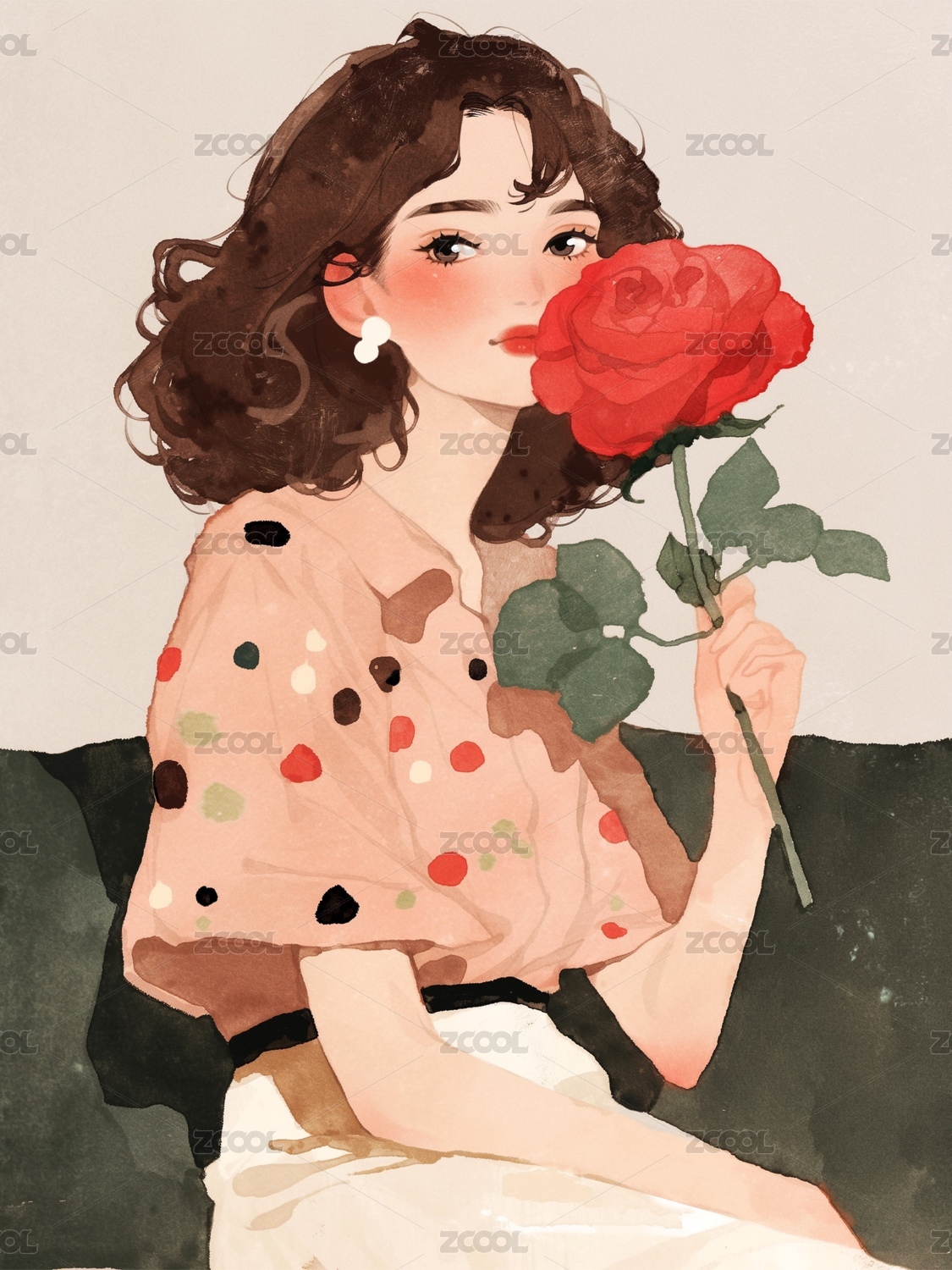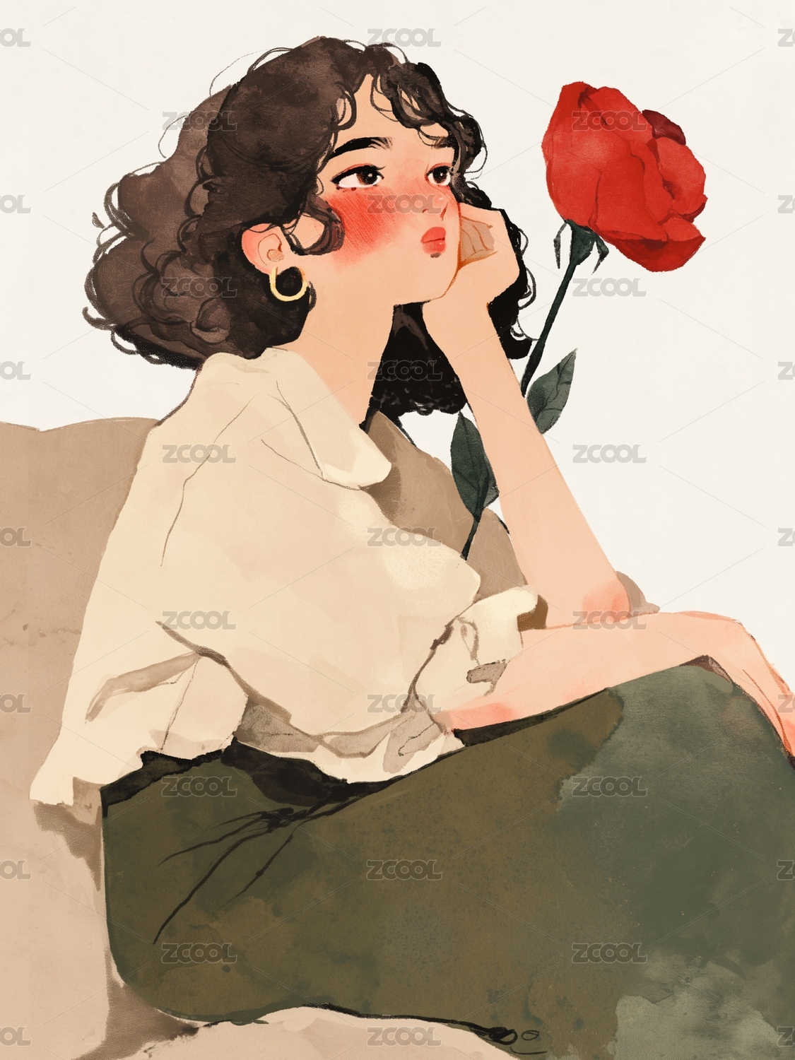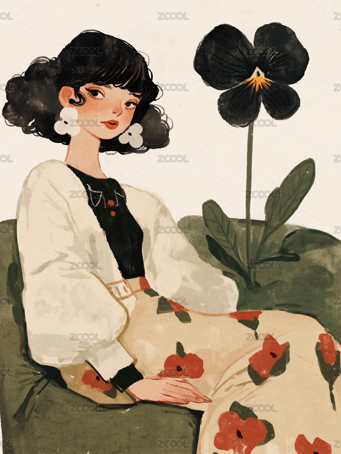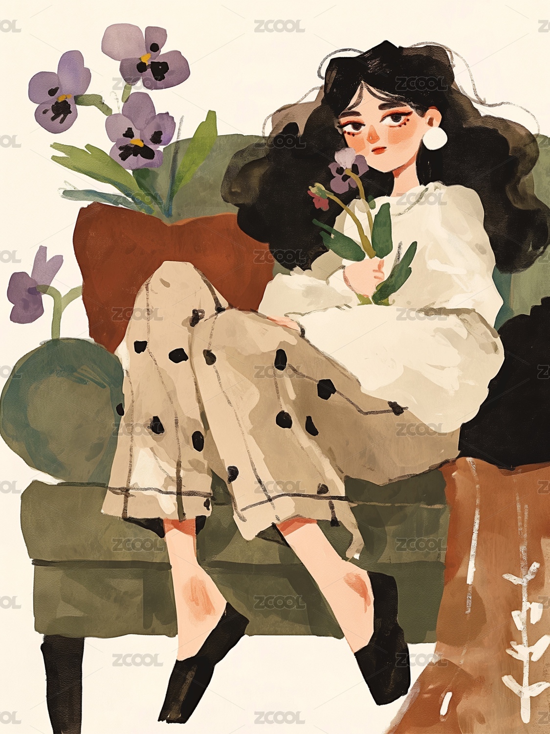 女生,松弛感,植物,鲜花,桌子,水彩,治愈