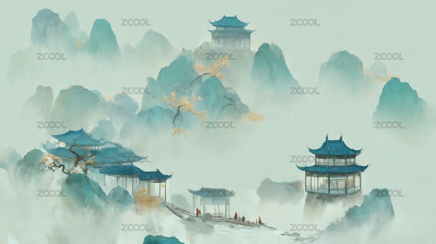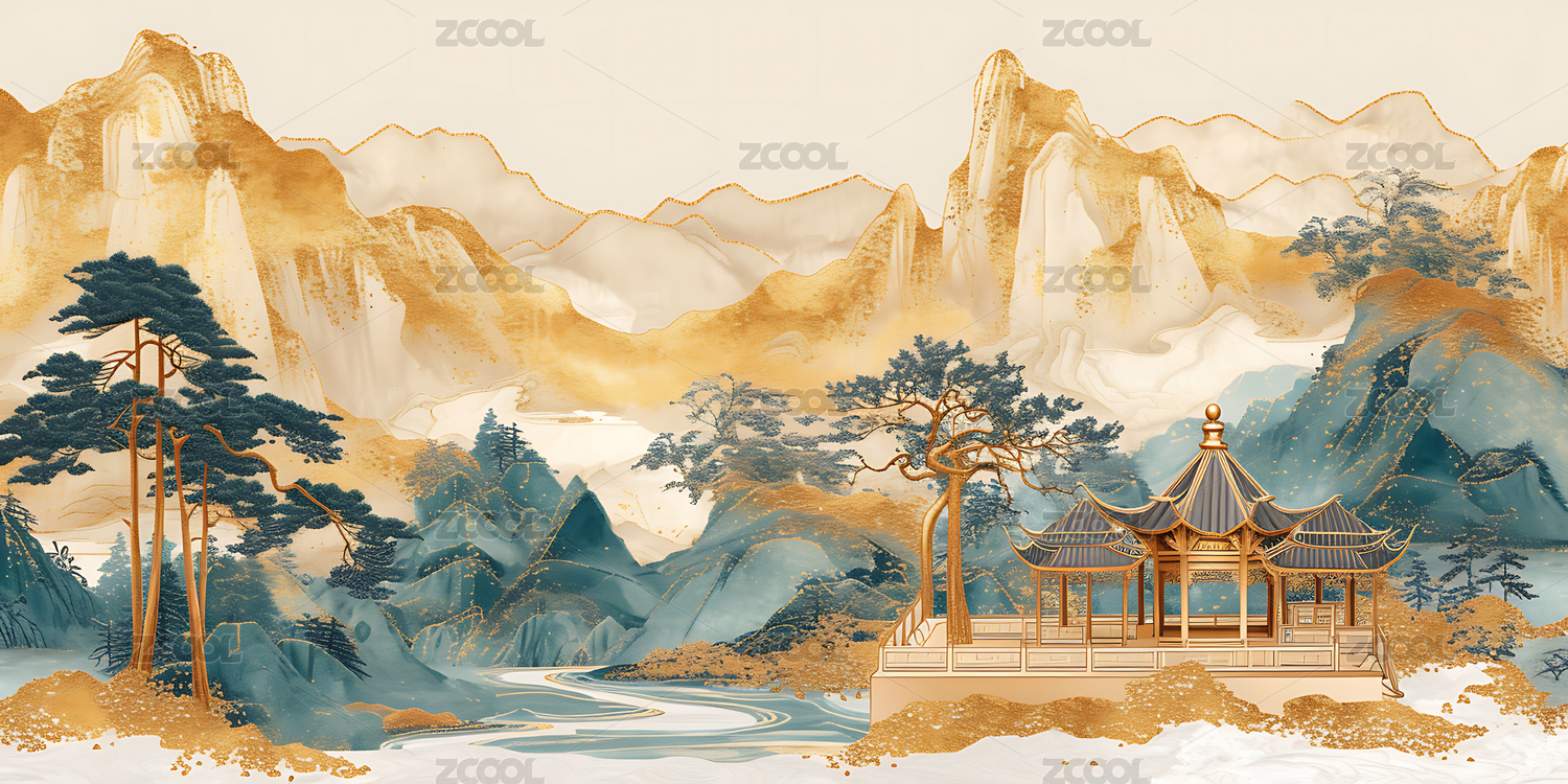 金色山峦青翠亭台水墨画