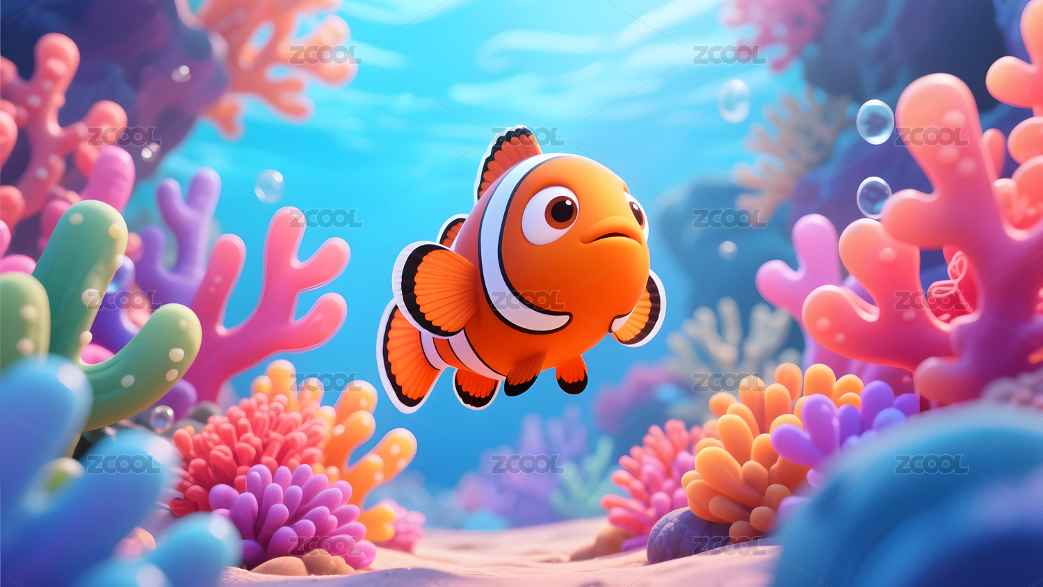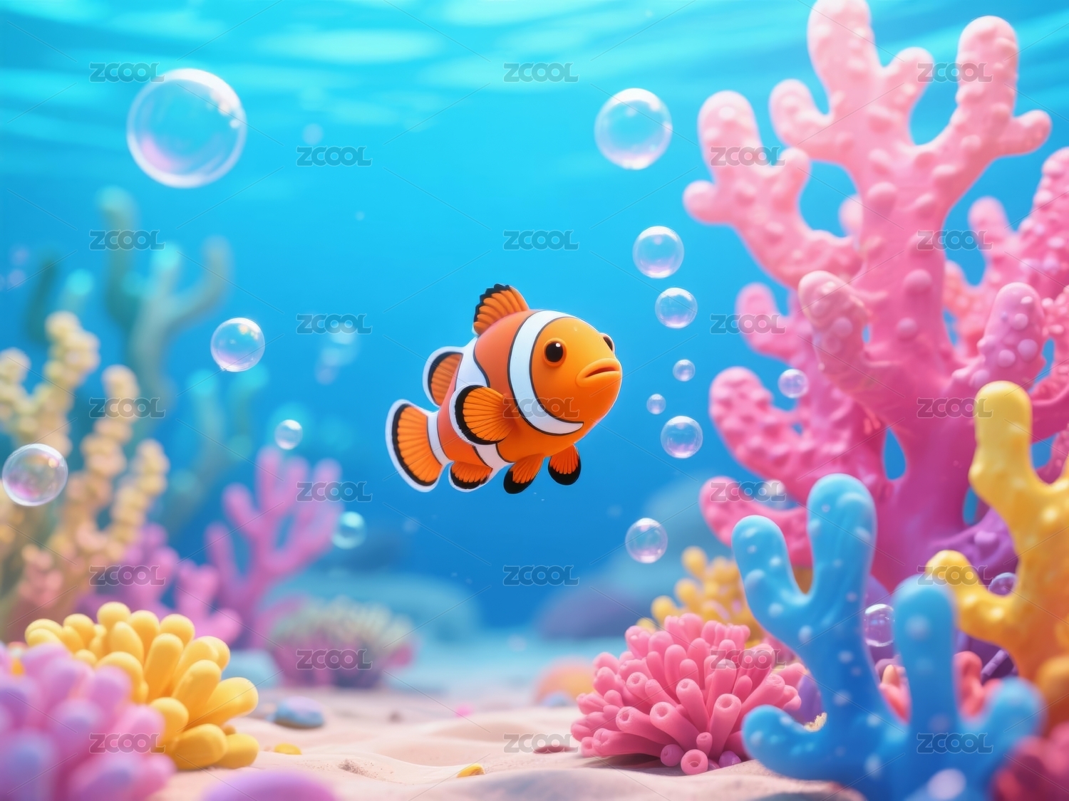 彩色,三维,海洋,生命,海底,动物,鱼,珊瑚,小丑鱼,海洋生物
