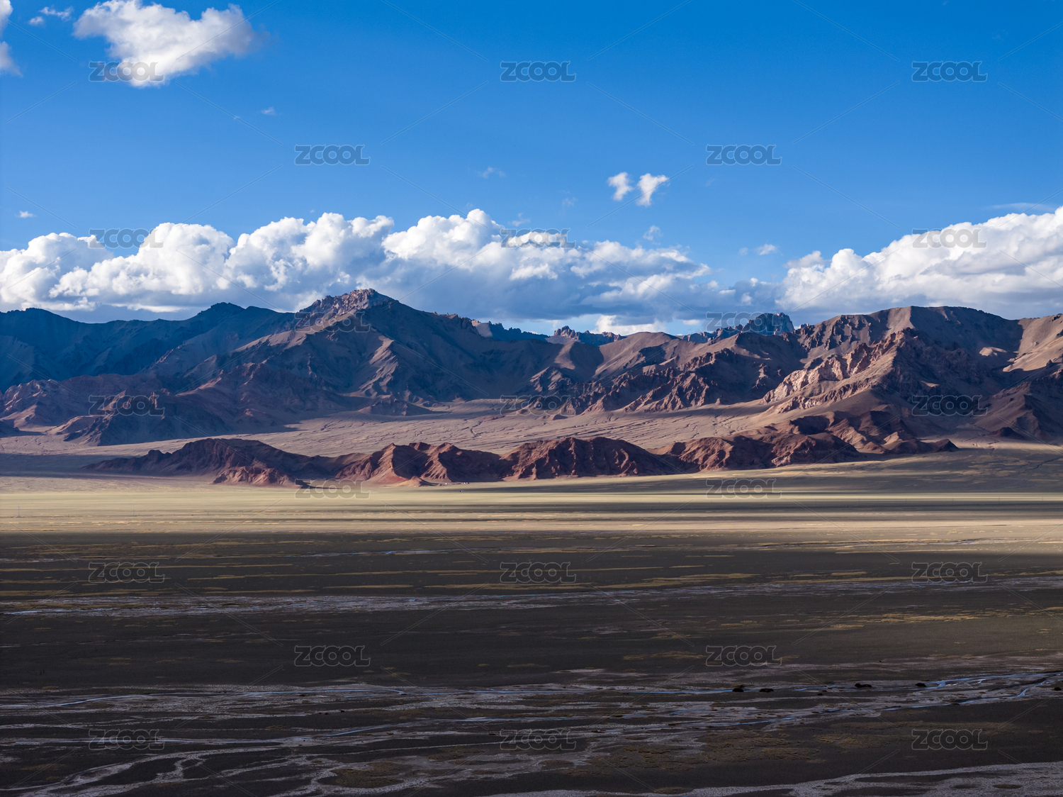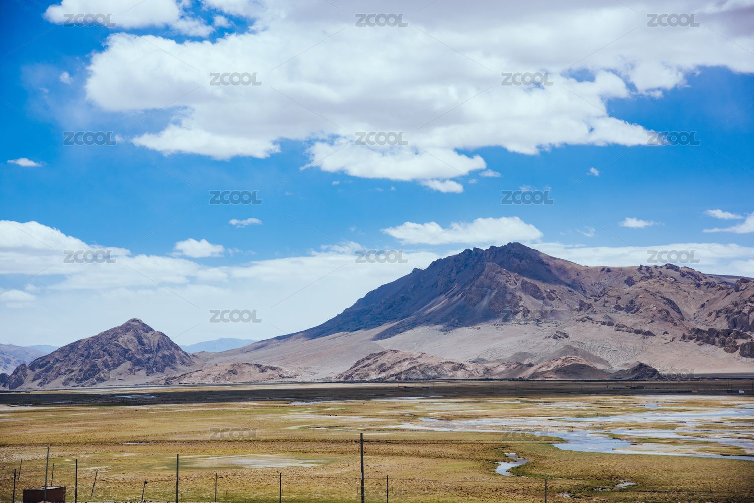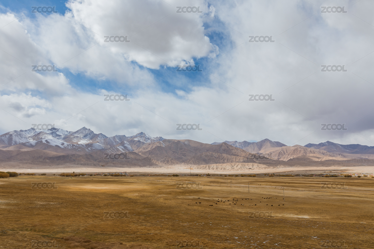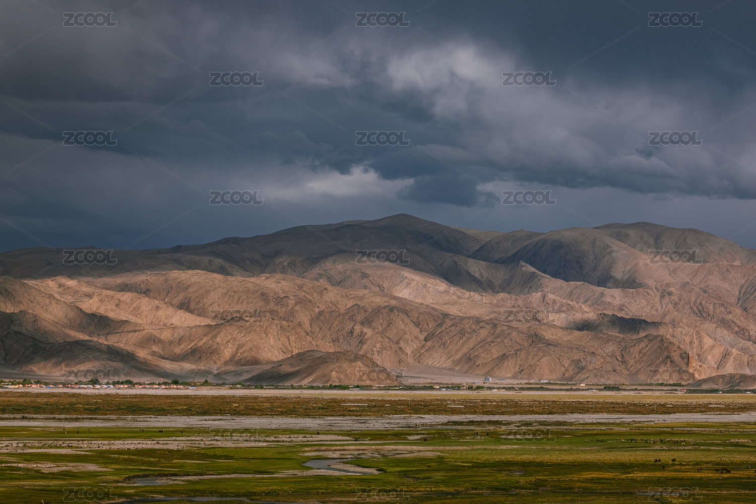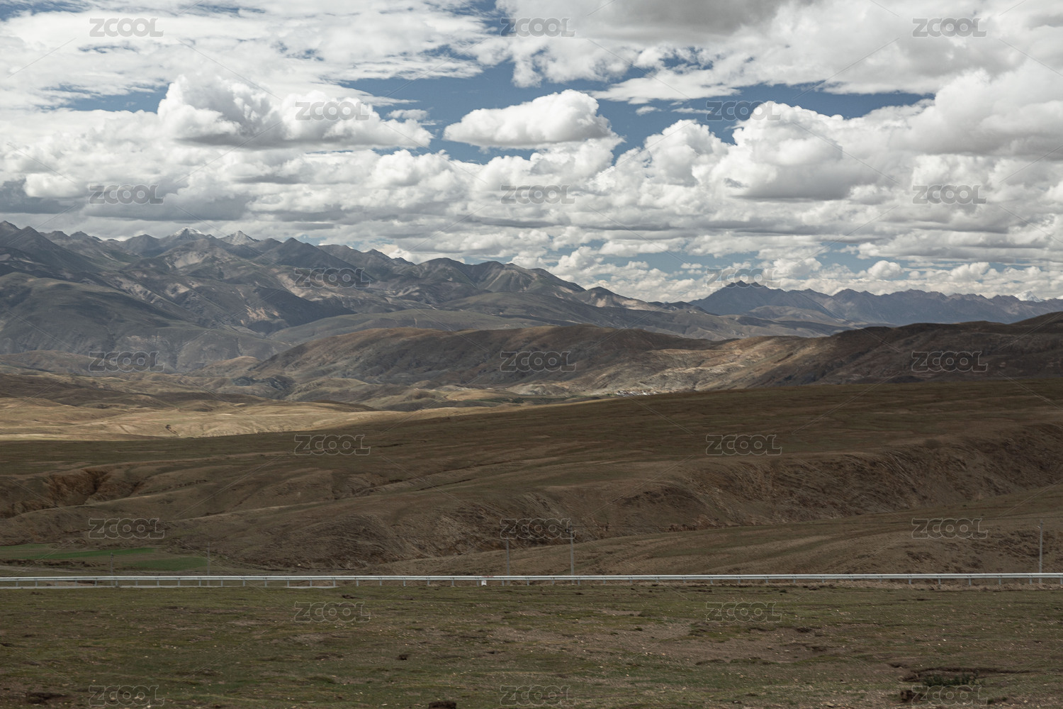 中国西藏日喀则的高原荒芜山峦与田园草地