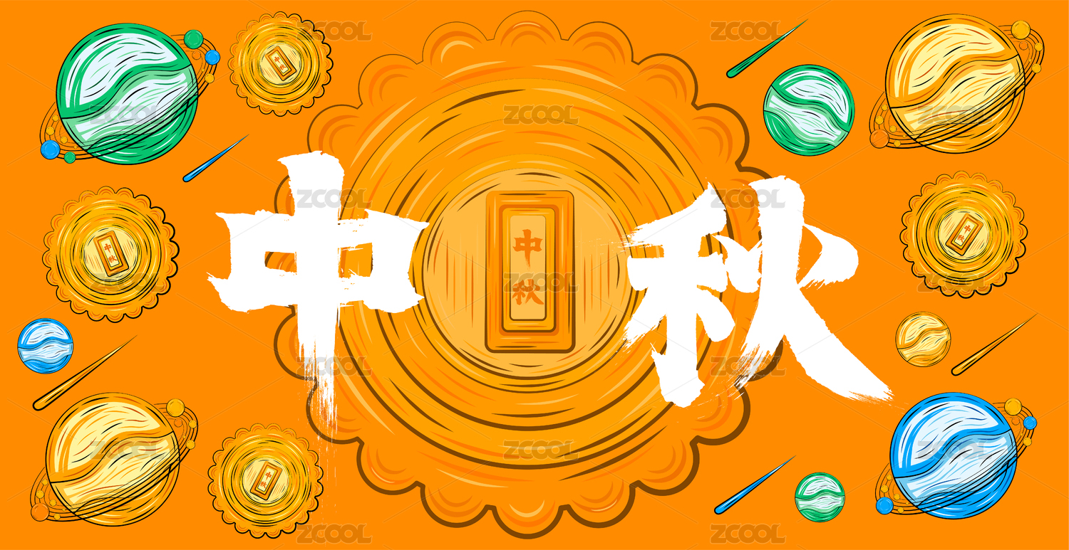 月圆中秋国潮手绘月饼星球星空矢量毛笔字
