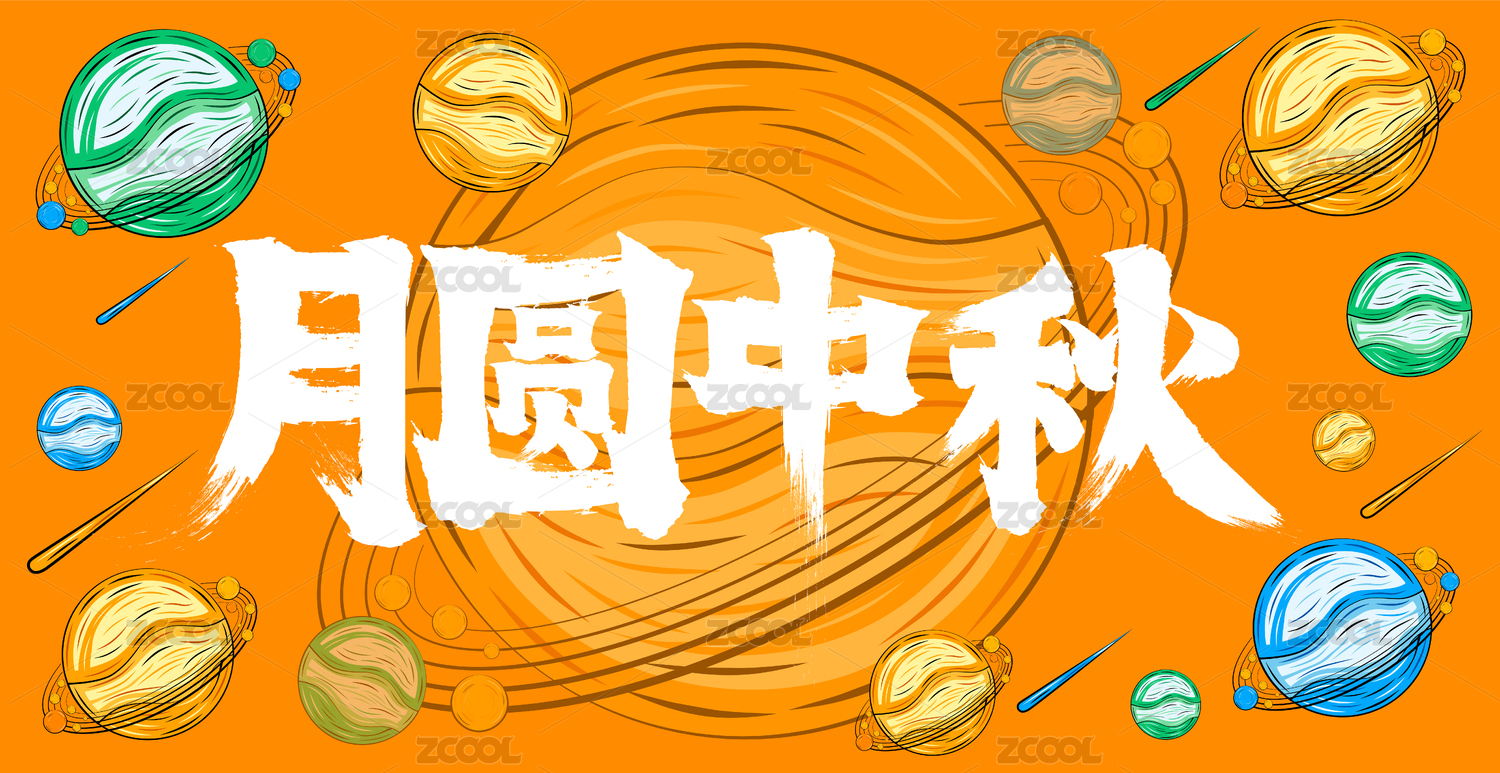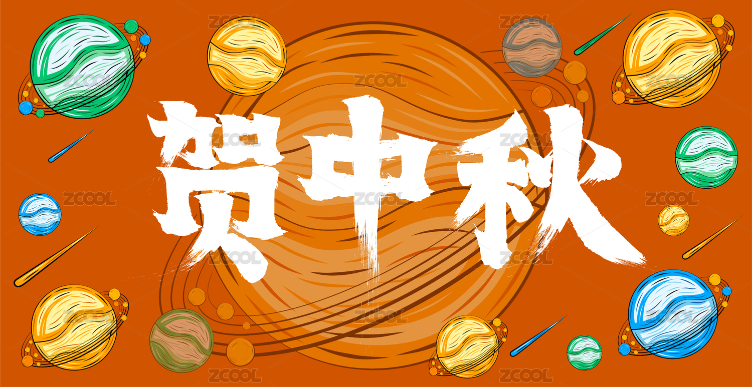 国潮手绘星球星空背景月圆中秋矢量毛笔字