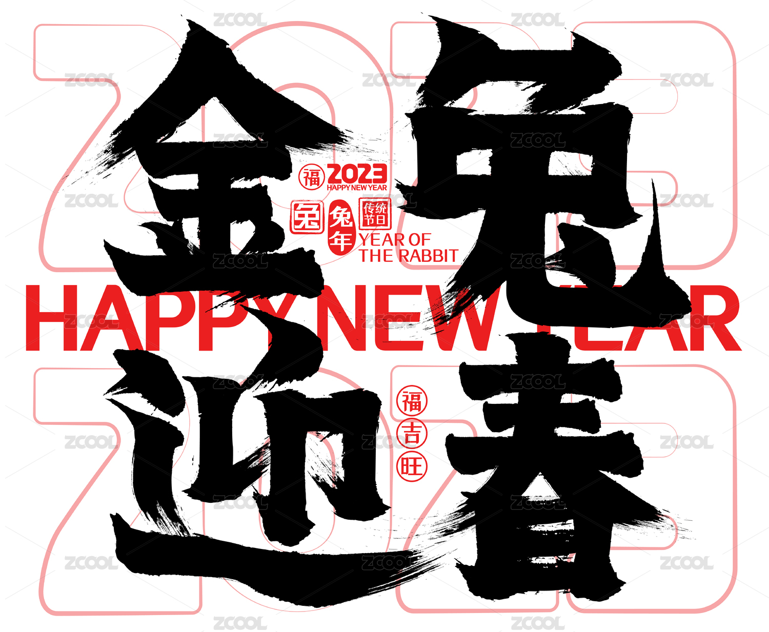 2023玉兔迎春喜庆中国红兔年春节毛笔字