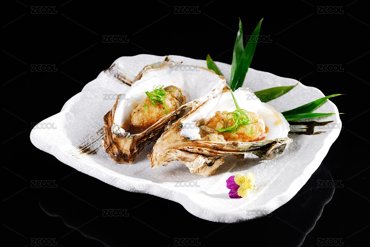 桌面上的盘子里的可口的可口的蒜蓉烤生蚝