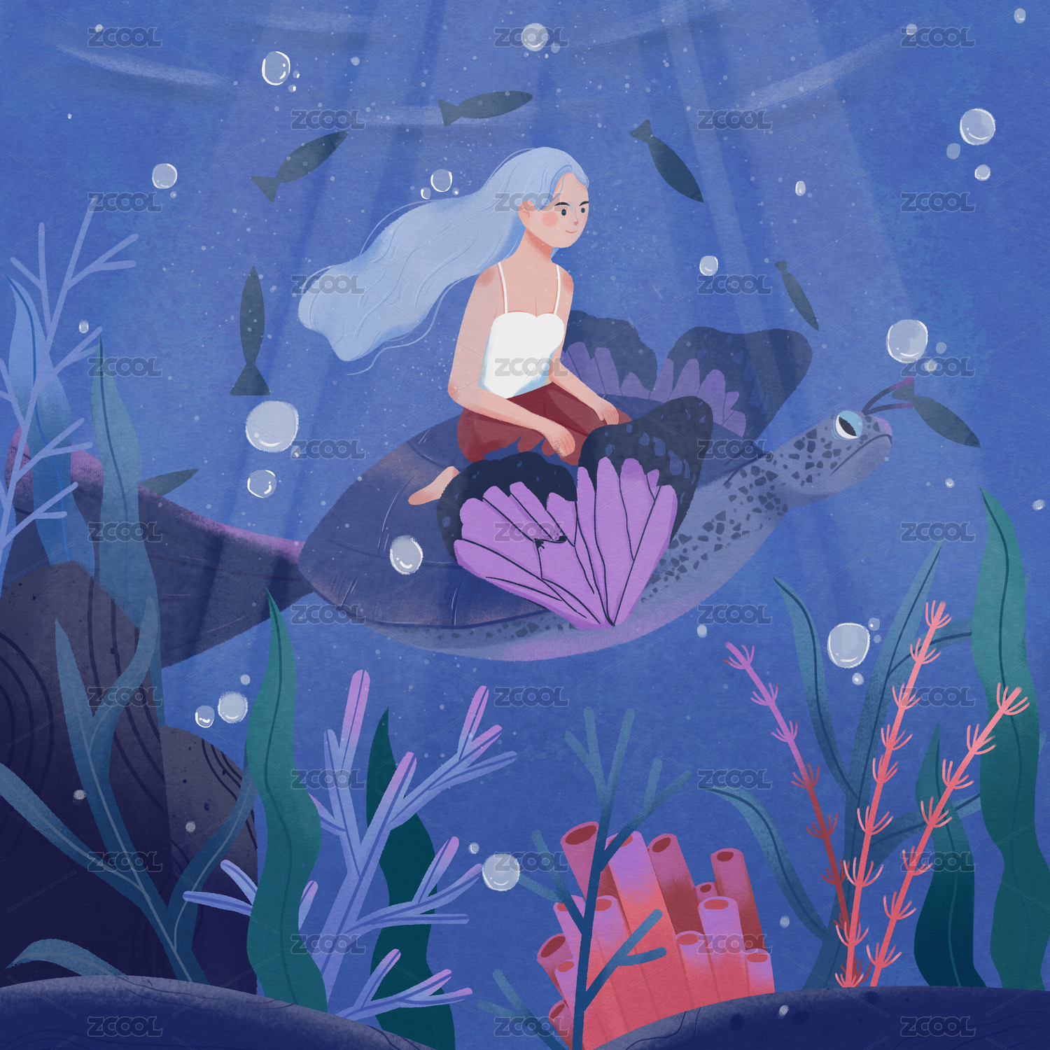 海洋,女孩,水母,插画,鱼,海草,鱼群,骑海豚的男孩,蓝色,蓝色裙子
