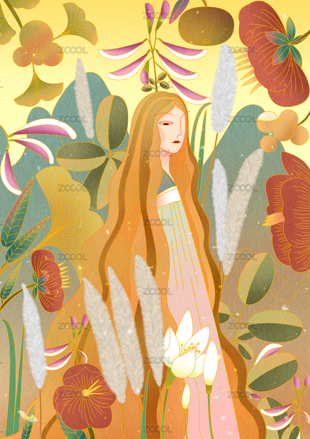 秋天女孩秘密花园植物治愈系插画