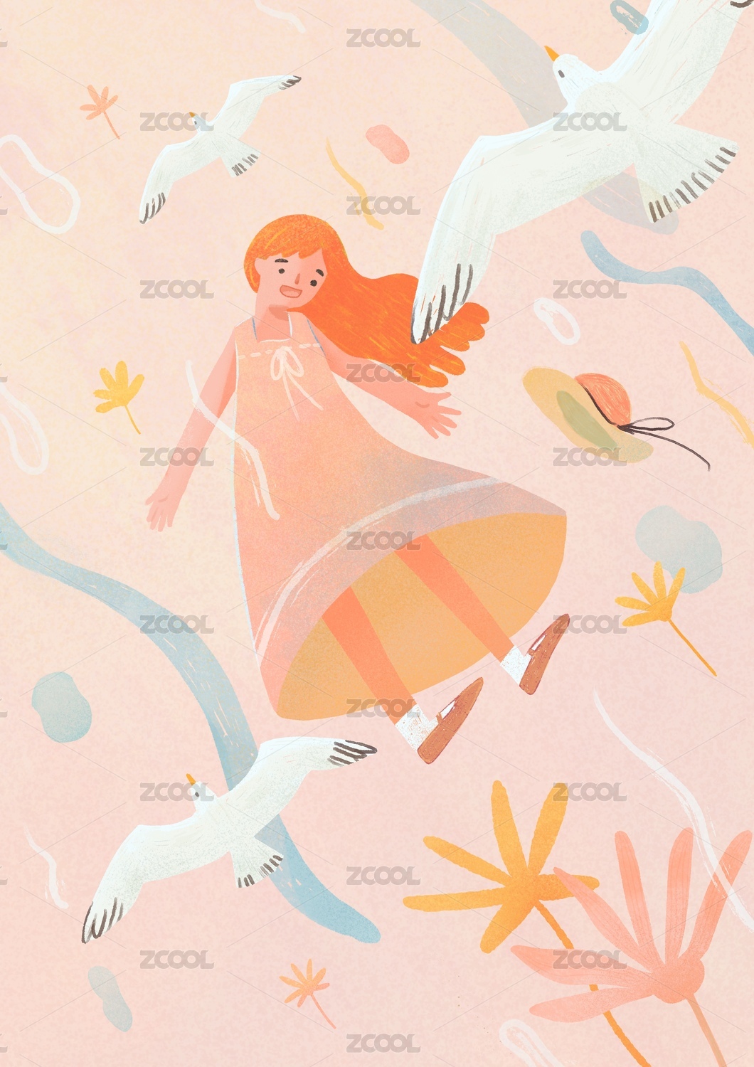 梦幻少女飞翔粉色儿童插画
