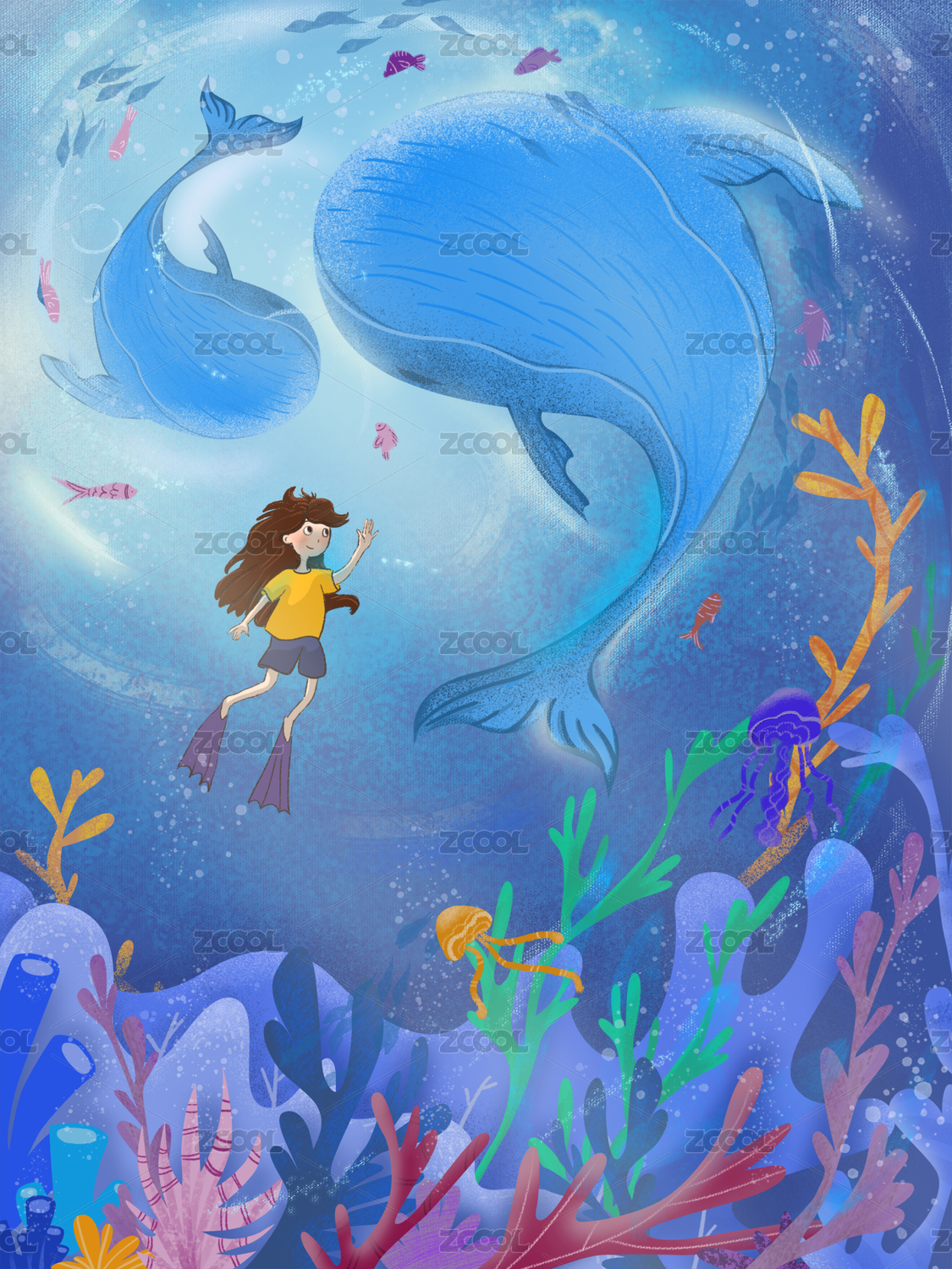 水下世界的小女孩和鲸鱼