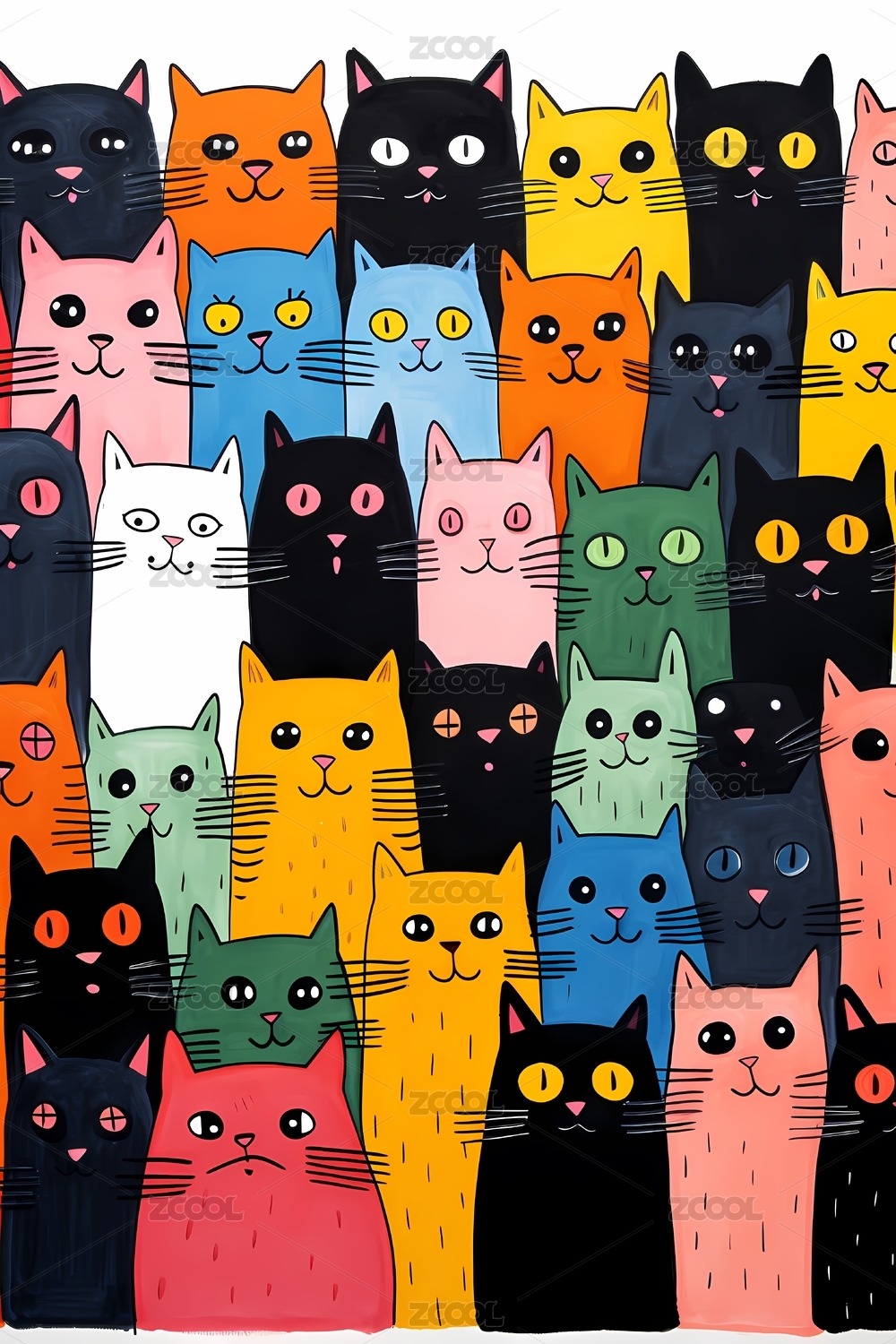 手绘彩色卡通猫猫质感笔触抽象装饰画背景