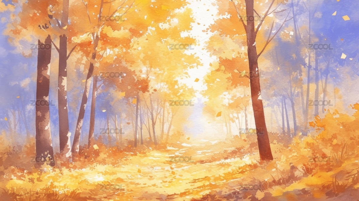 秋天,风景,插画,树,树叶,黄色,氛围,秋季,AIGC202402,水彩