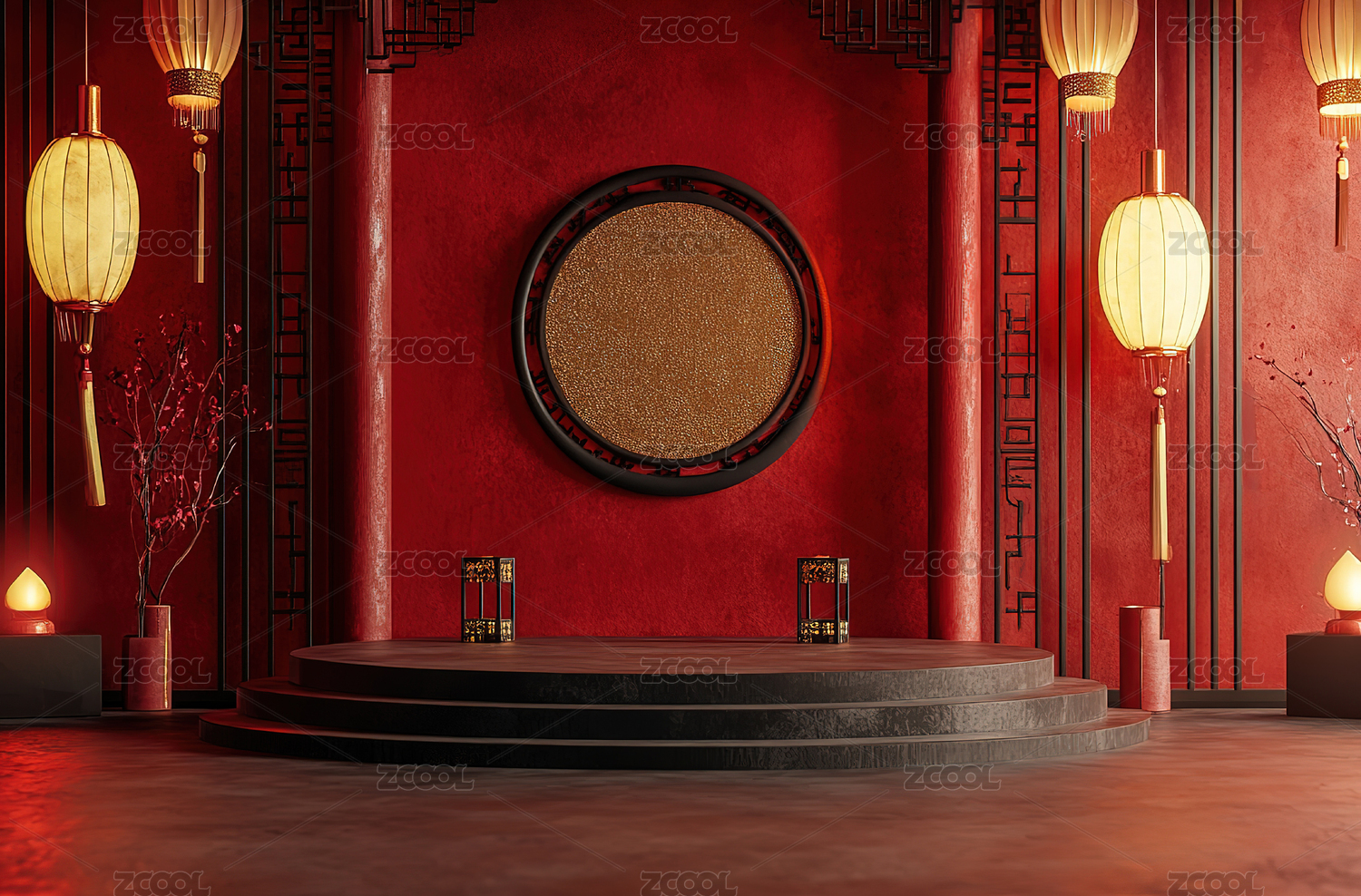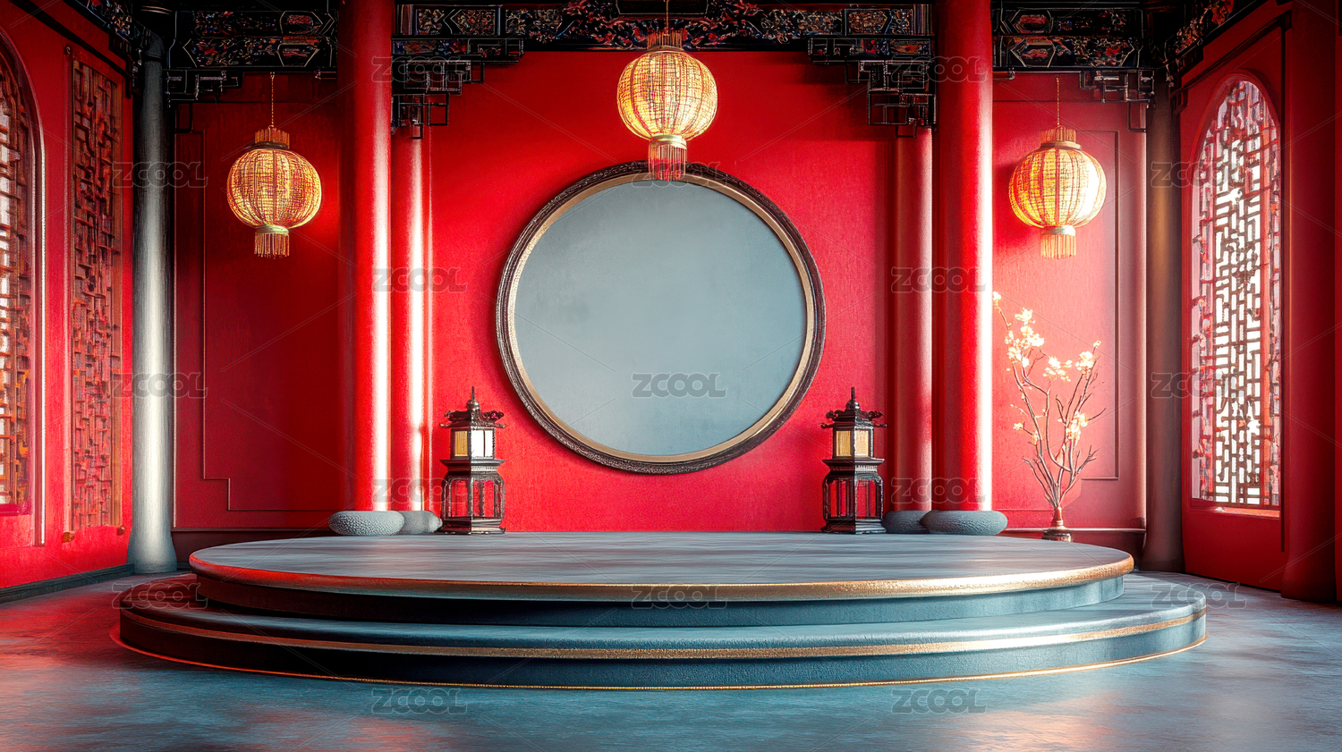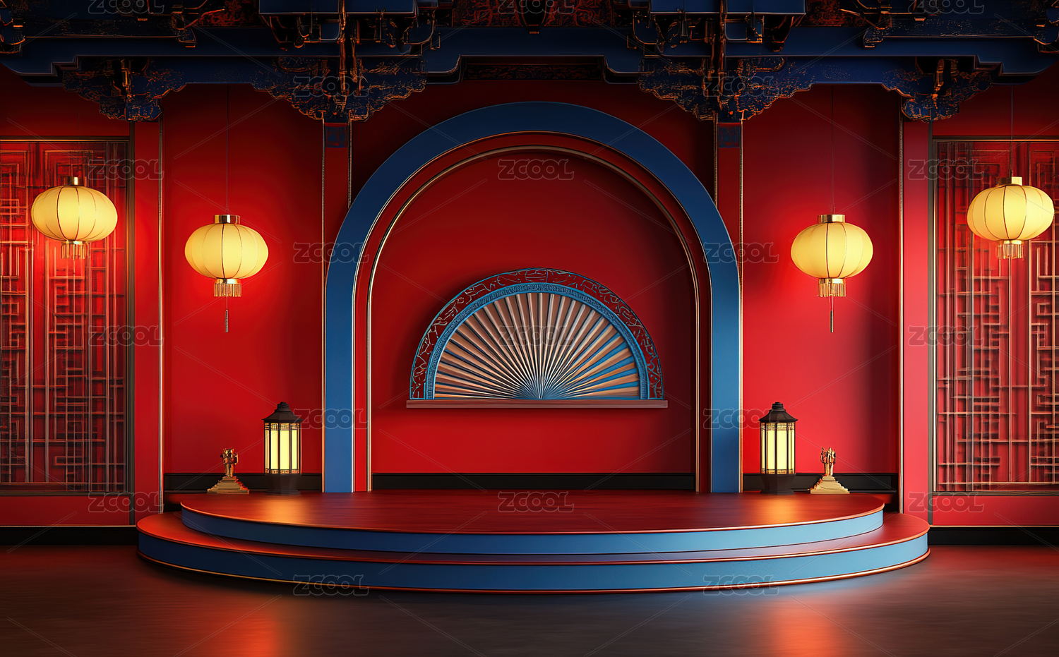 中国风,红色,喜庆,蓝色,产品展台,节日,灯笼,3D渲染,产品展示台,场景