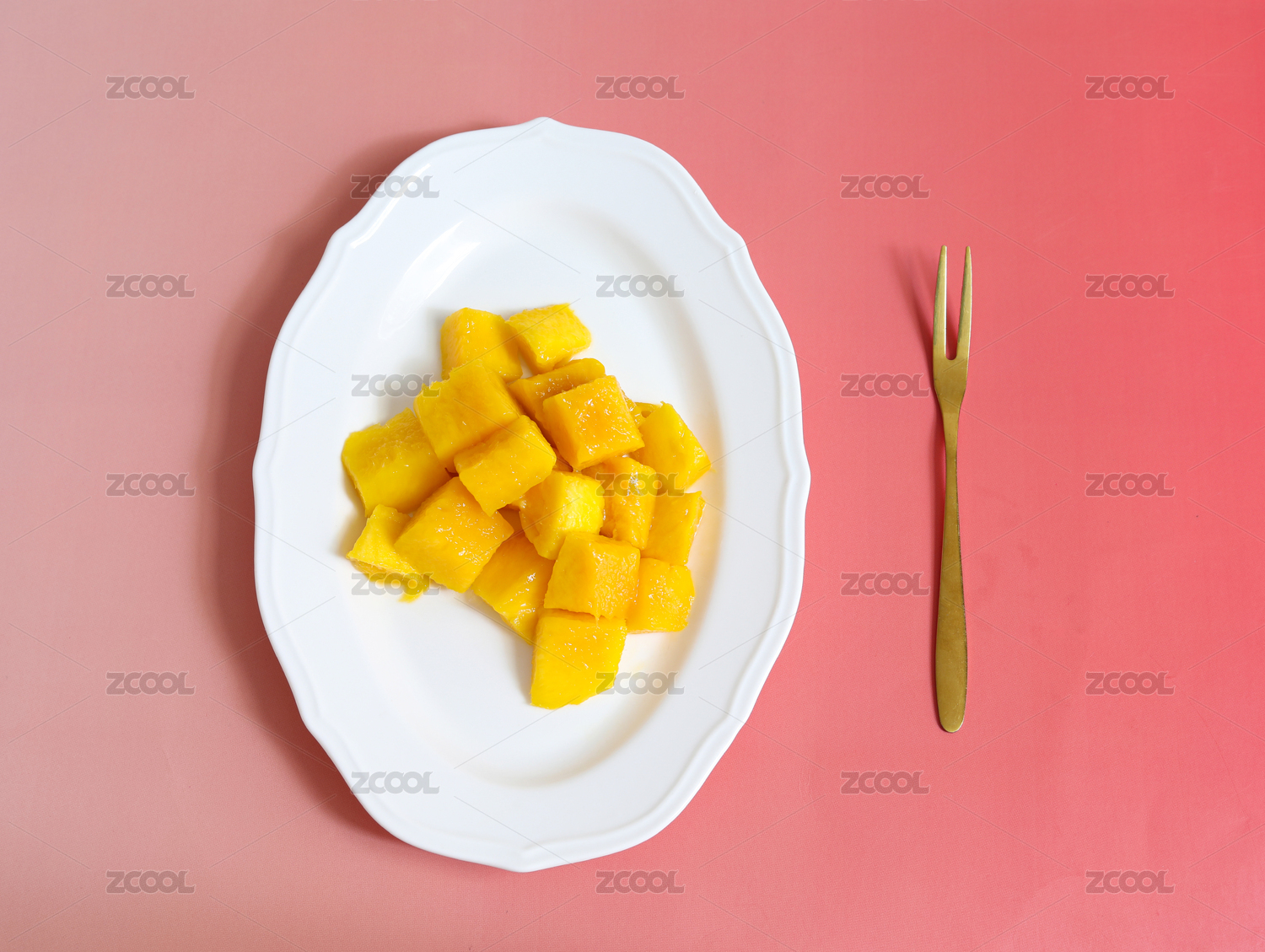 一碟子切开的新鲜热带水果芒果果肉下午茶