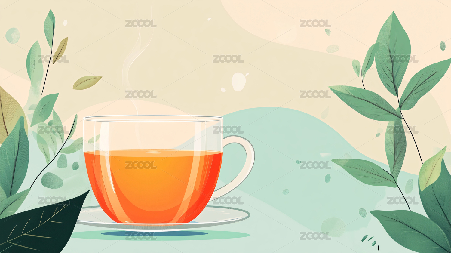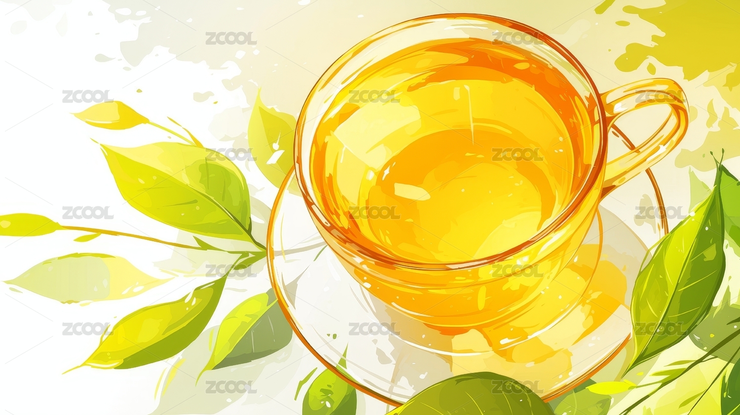 简单清新明亮杯中的茶水茶叶插画扁平绘画