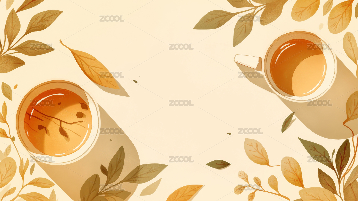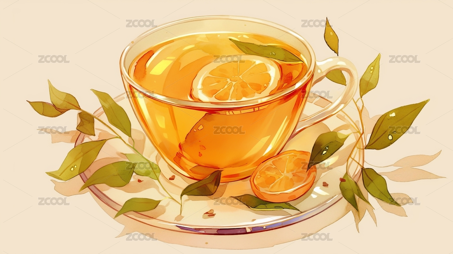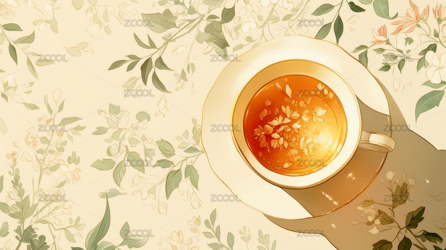 杯中热茶伴绿叶清新画面