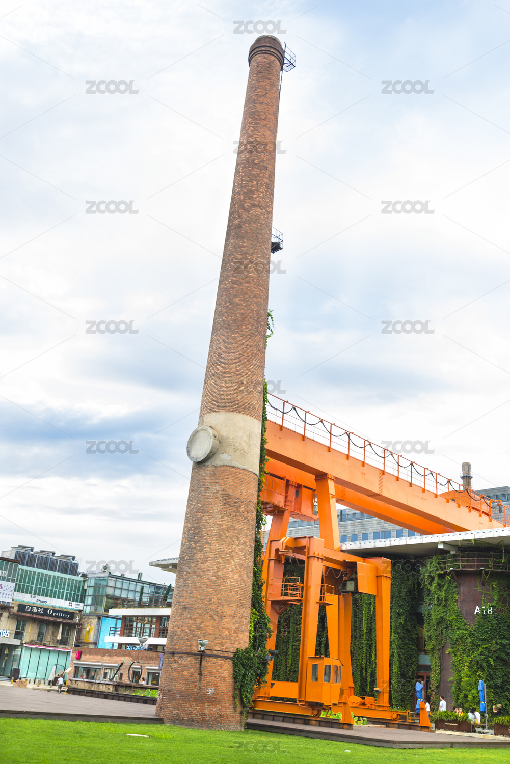 秋天蓝天白云下北京798艺术区的钢铁建筑