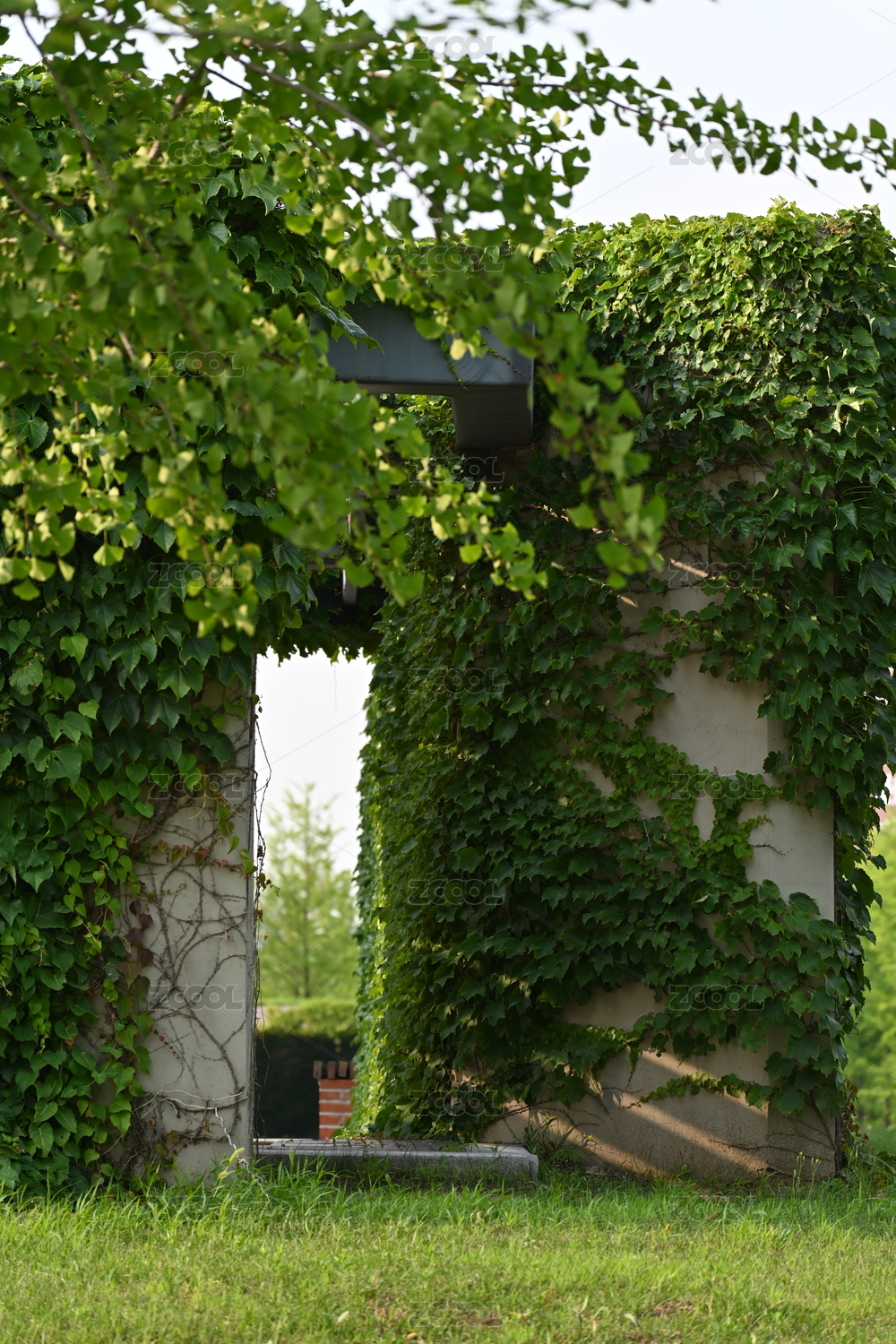 香樟行道树和布满常春藤的围墙