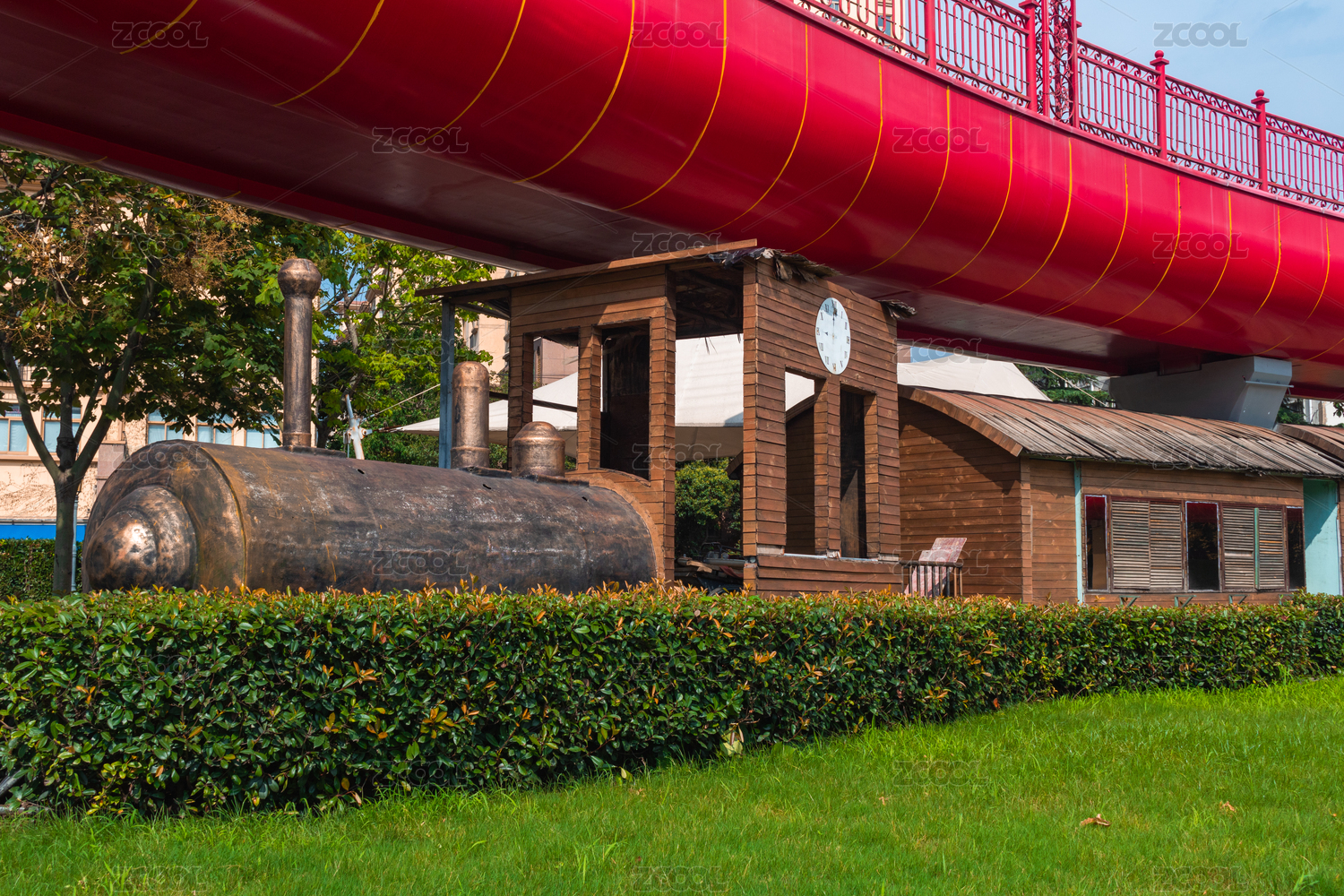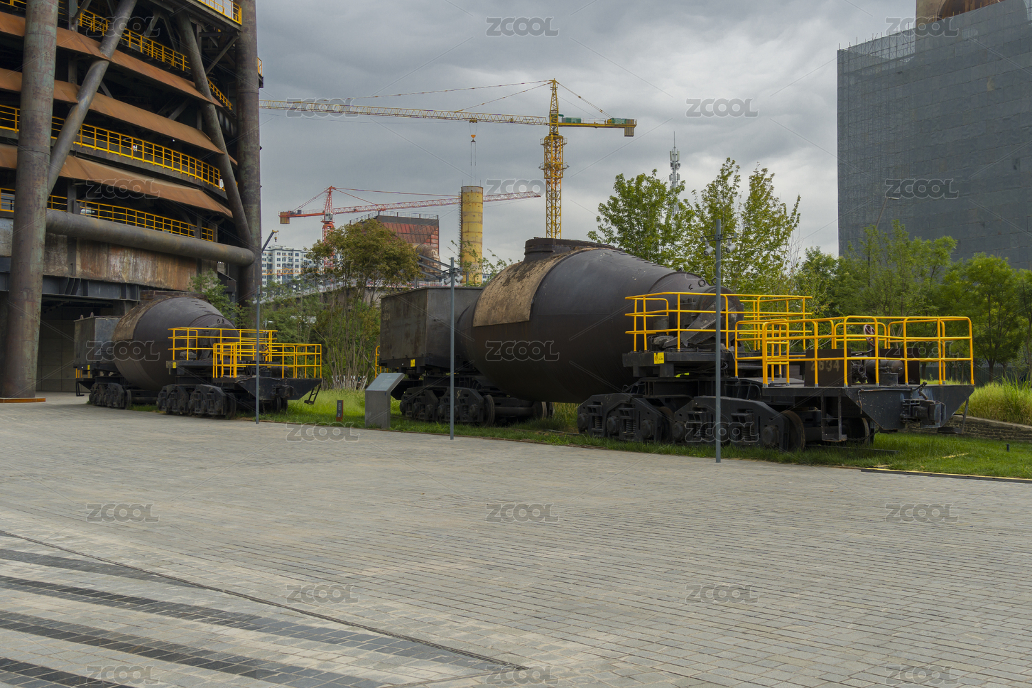 中国上海浦东滨江公园的休闲建筑及旧机械景观