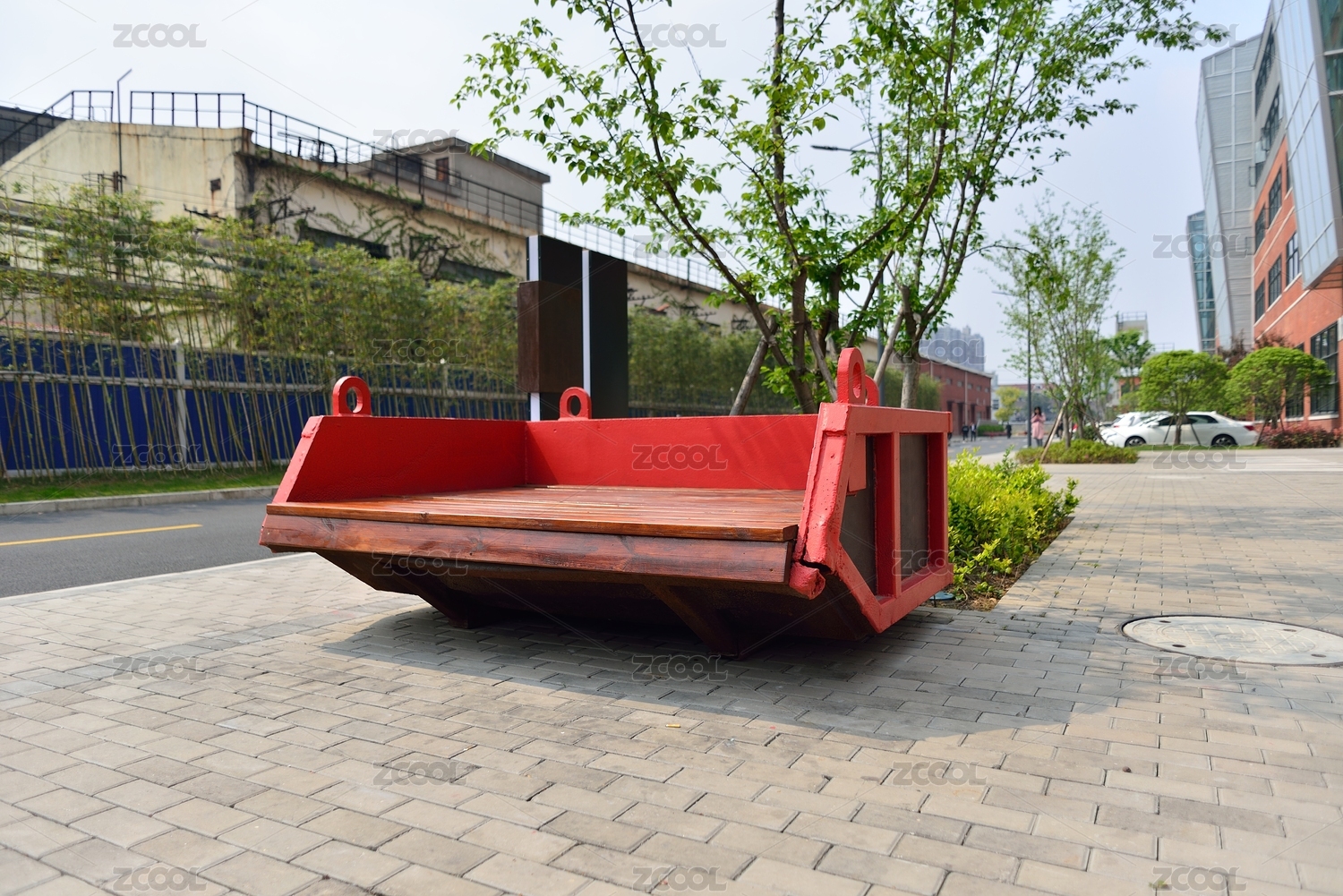 工业园区的红色钢制休闲椅