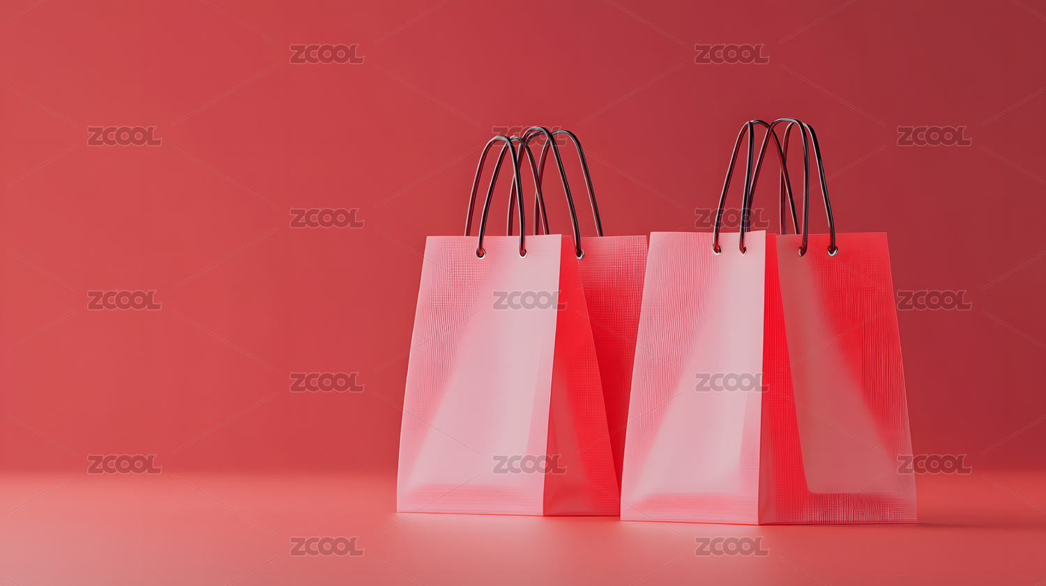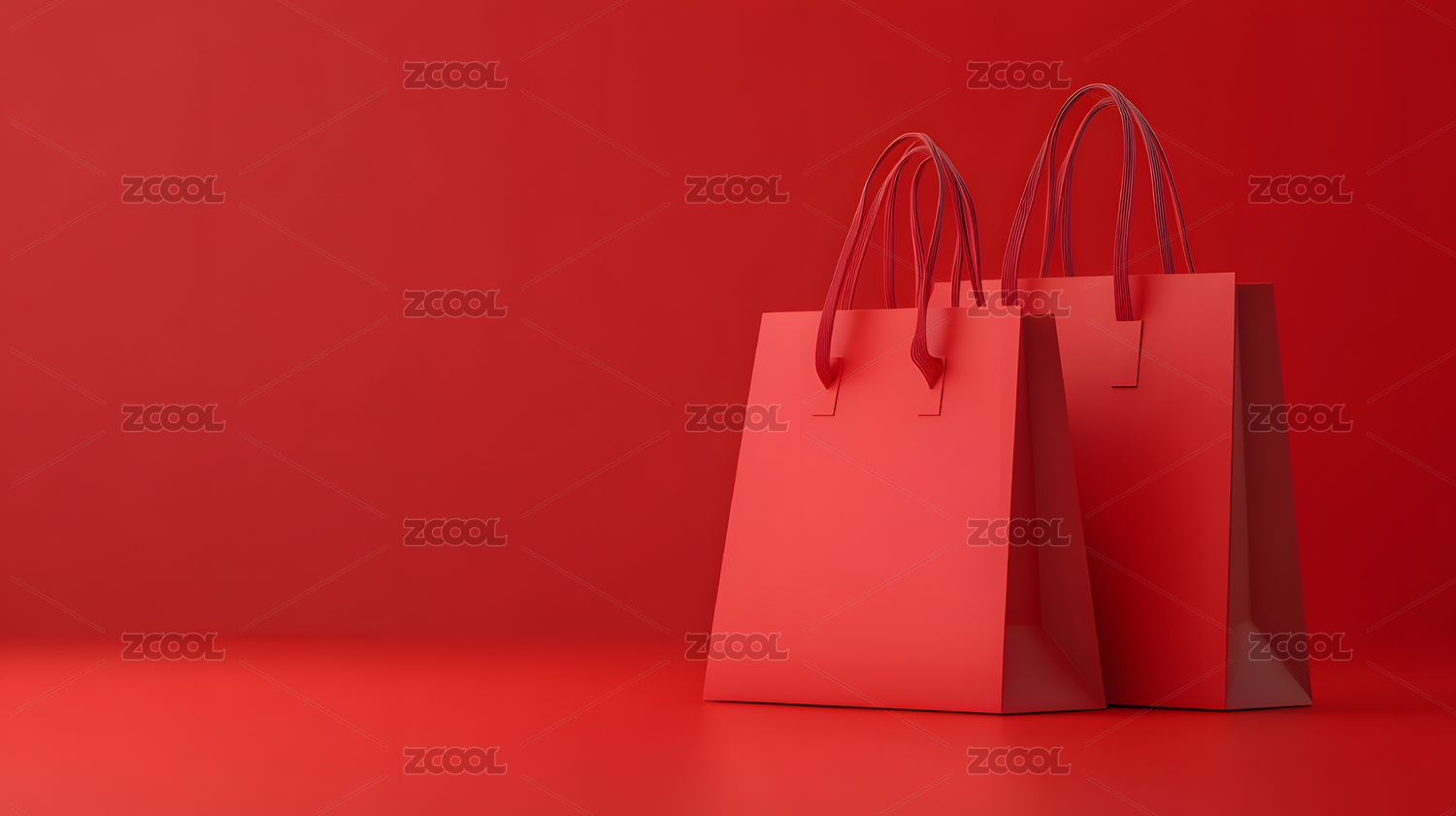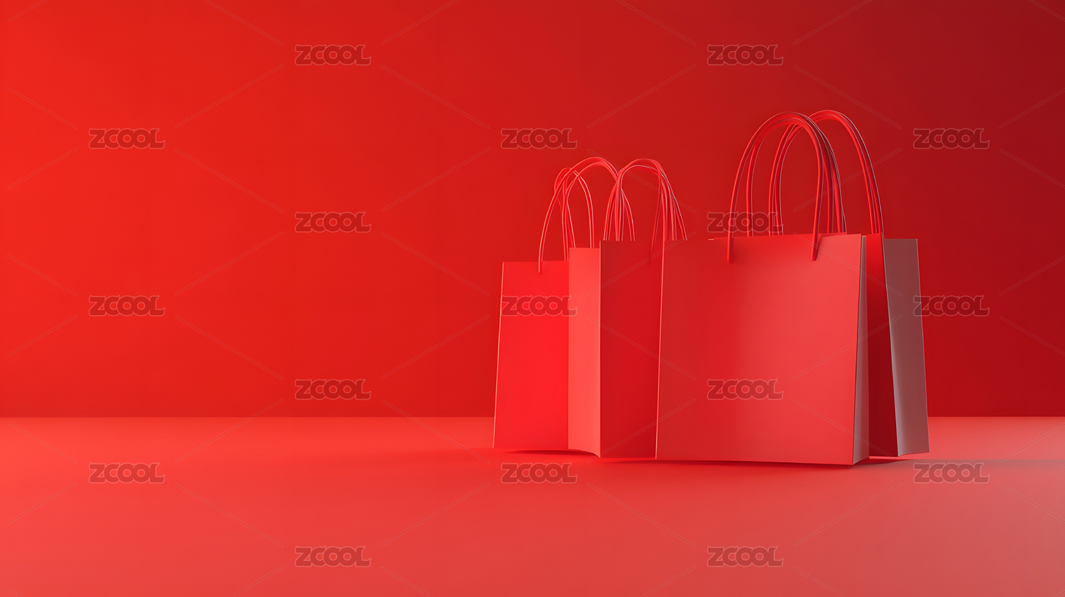 红色纸盒子上一只购物袋,时尚炫彩消费购物概念海报