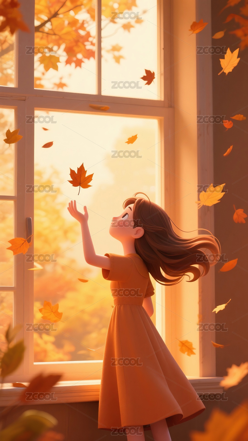 女孩在桥上欣赏秋天的森林风景治愈插画