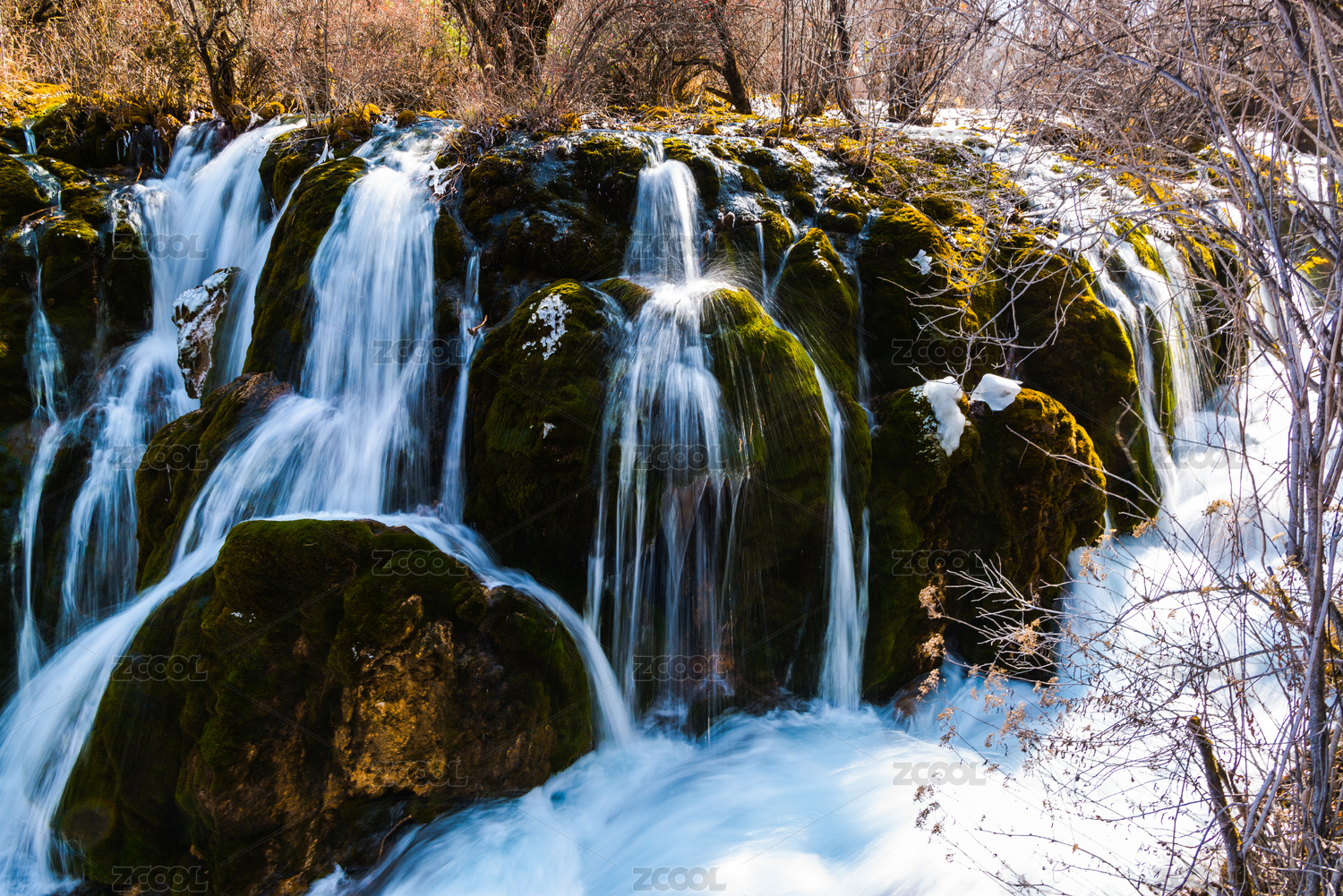 中国四川阿坝九寨沟珍珠滩瀑布融雪景观