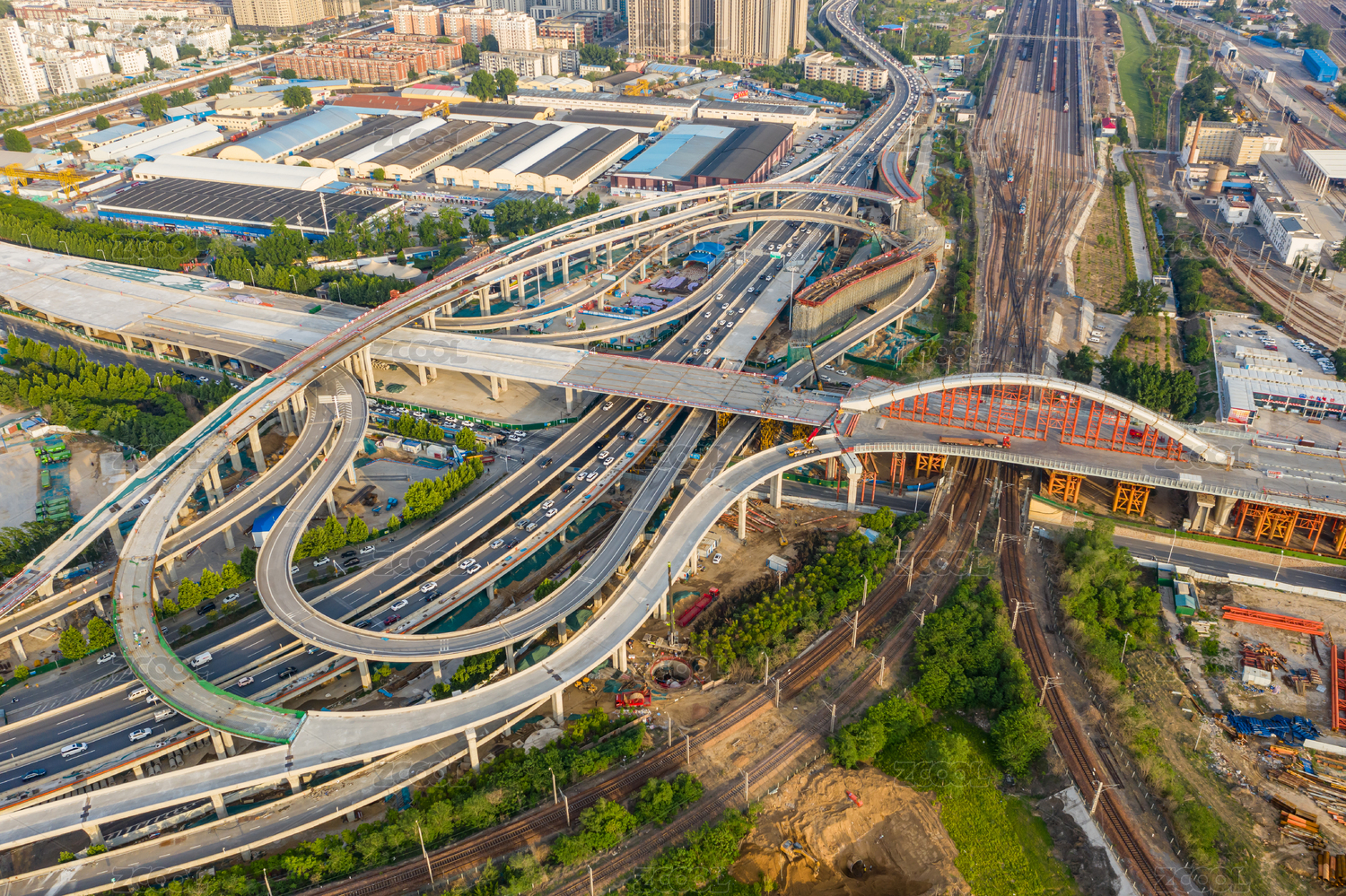 航拍郑州彩虹桥拆解新建工程匝道钢箱梁架设