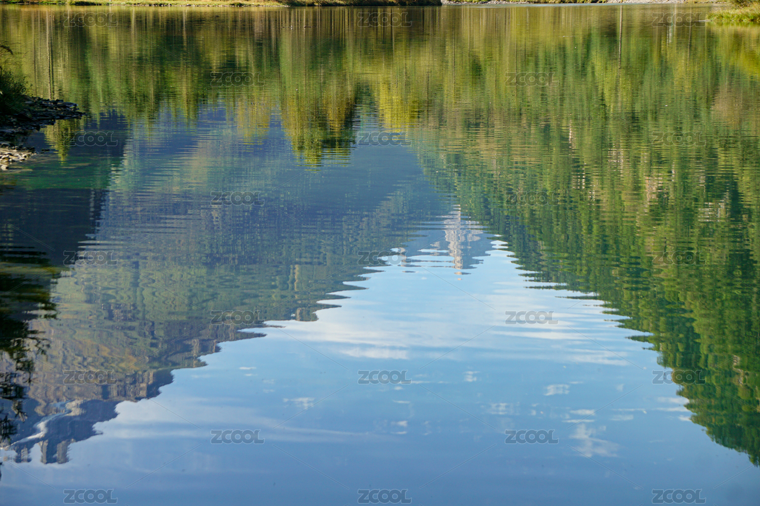 晴朗天气蓝天白云下的树木和水面倒影背景图