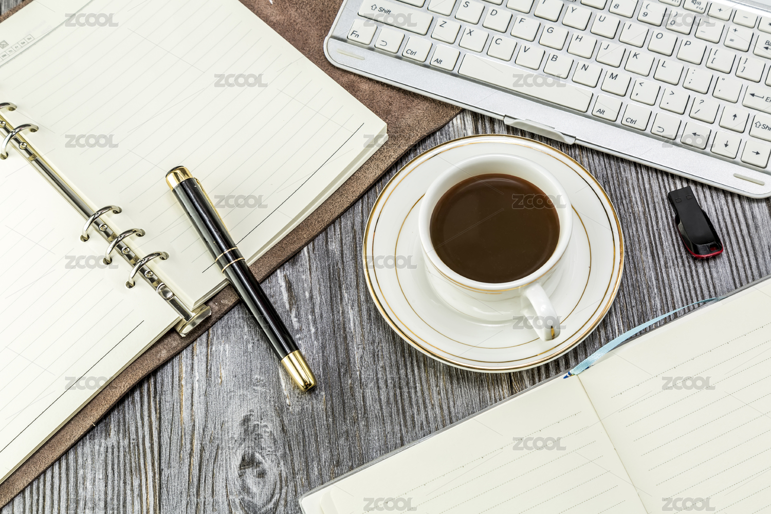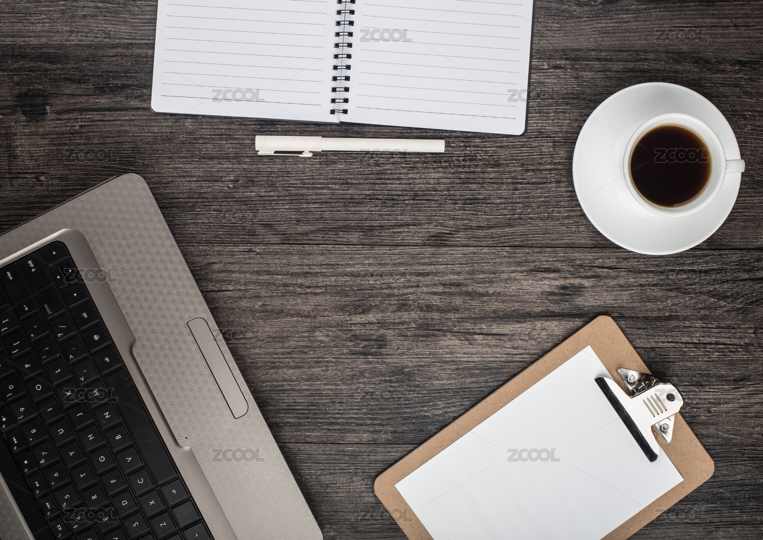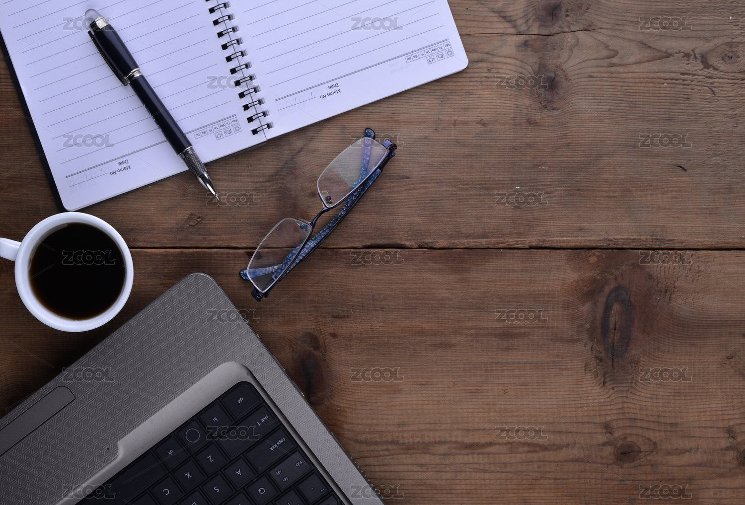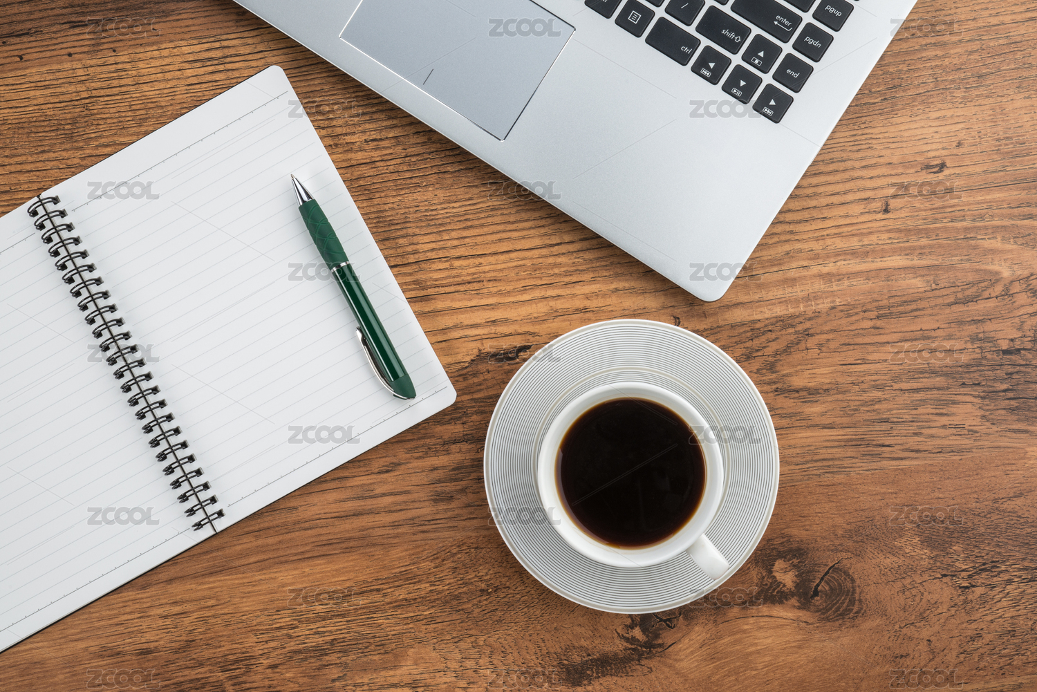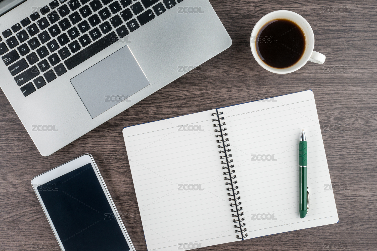 笔记本电脑,笔记本和笔与办公桌咖啡杯