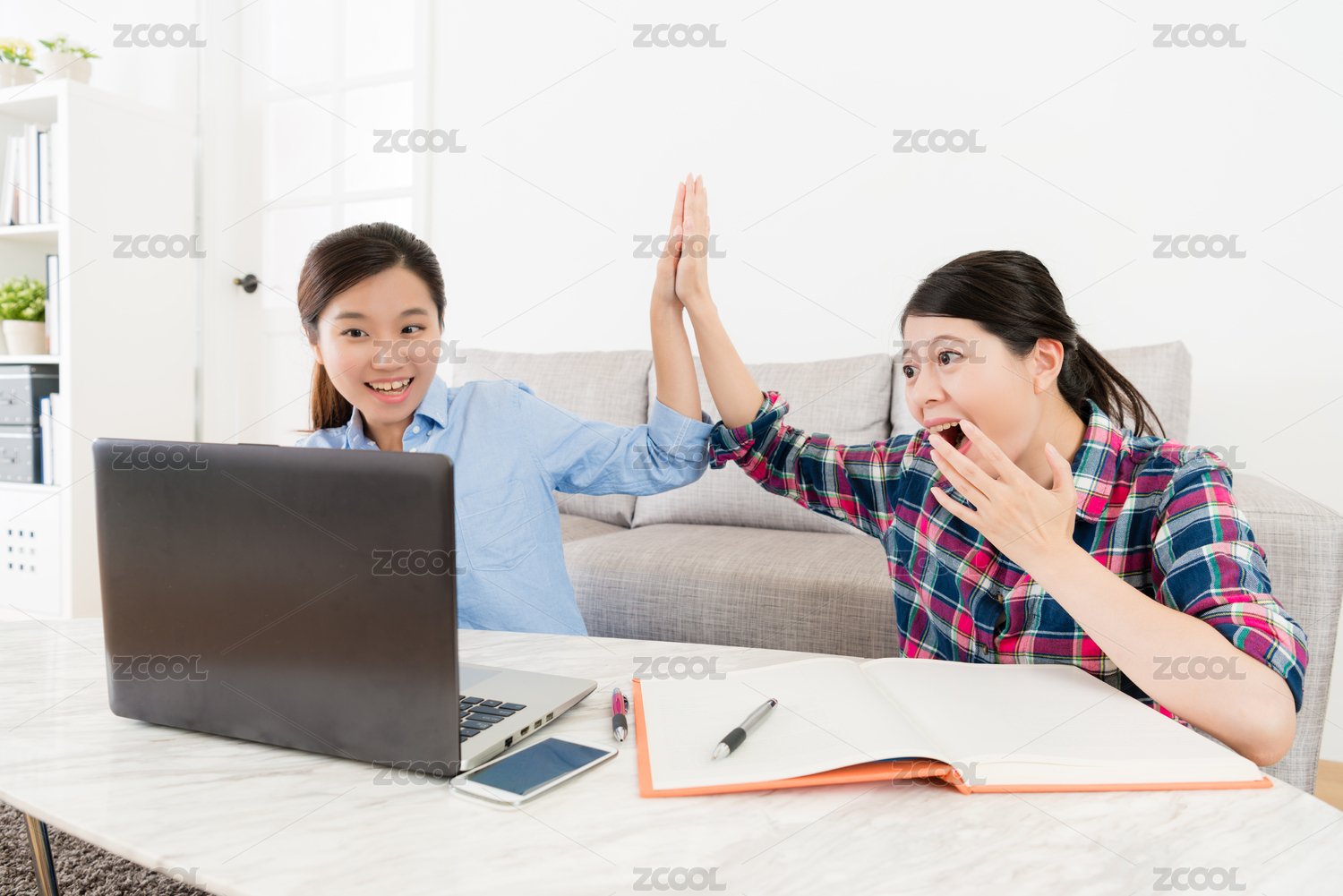 使用移动电脑在家里做功课开朗的漂亮女学生,完成学校做报告击掌相互庆祝。