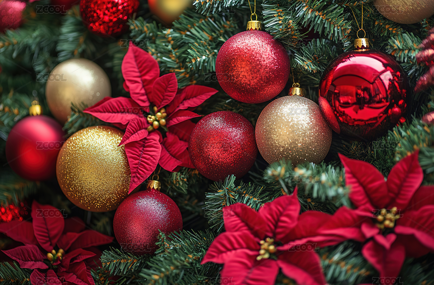 冷杉树枝上的红色和金色圣诞装饰品