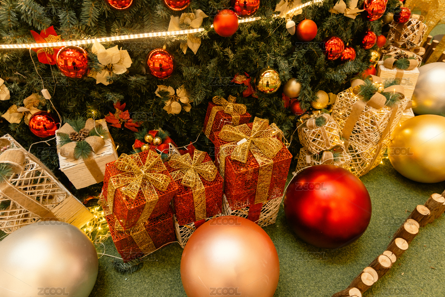 礼物装饰的圣诞树局部