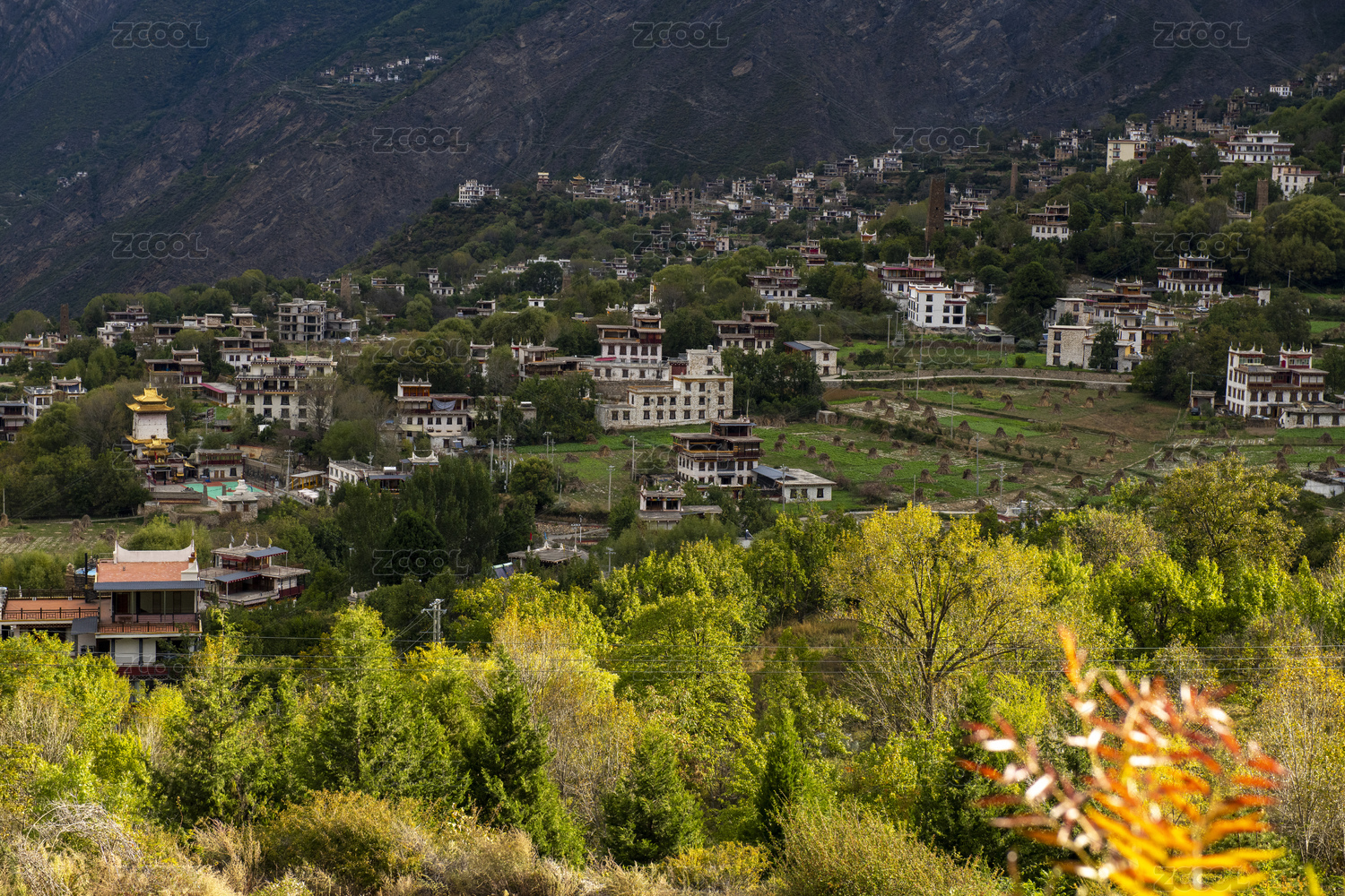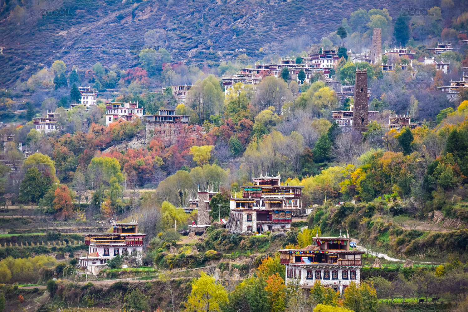 中国四川甘孜丹巴中路藏寨的民居和彩林秋色
