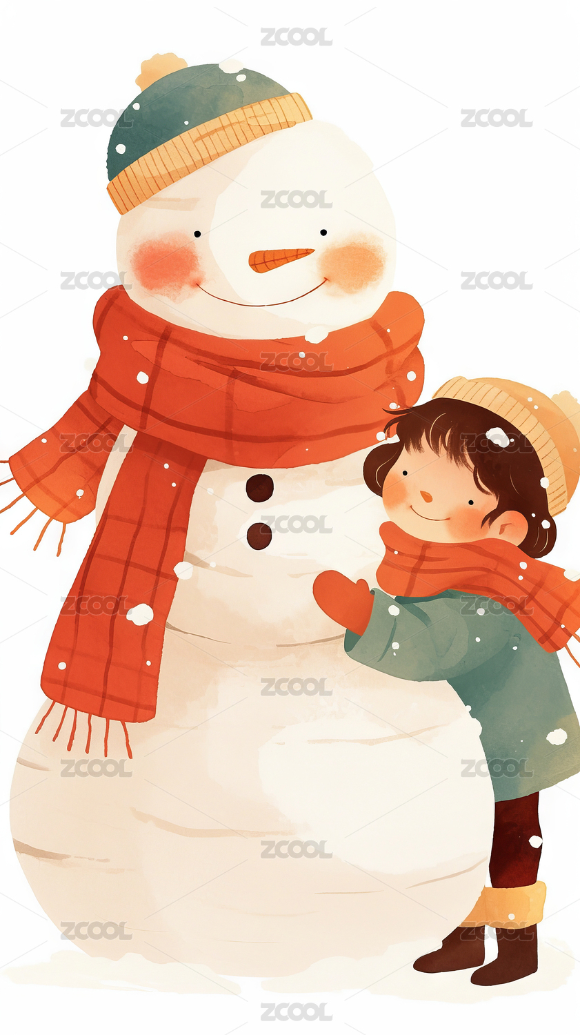 冬天女孩雪人唯美插画