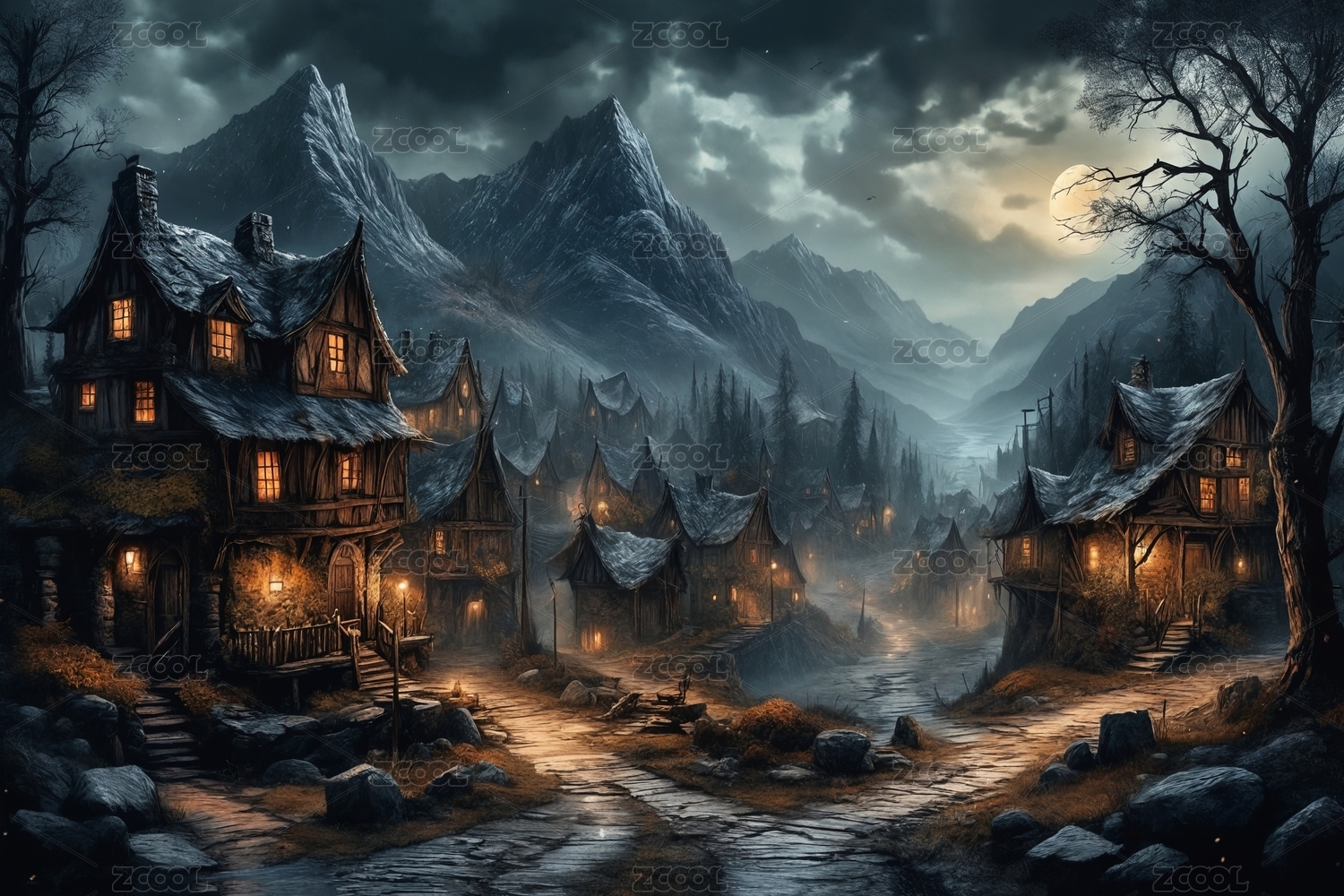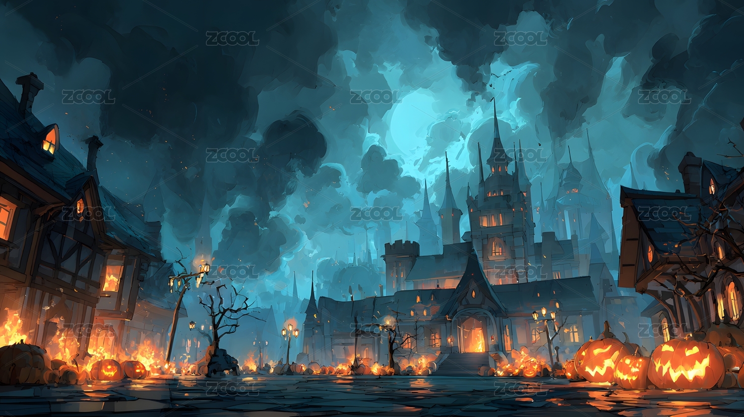 万圣节夜晚的哥特式小镇景象