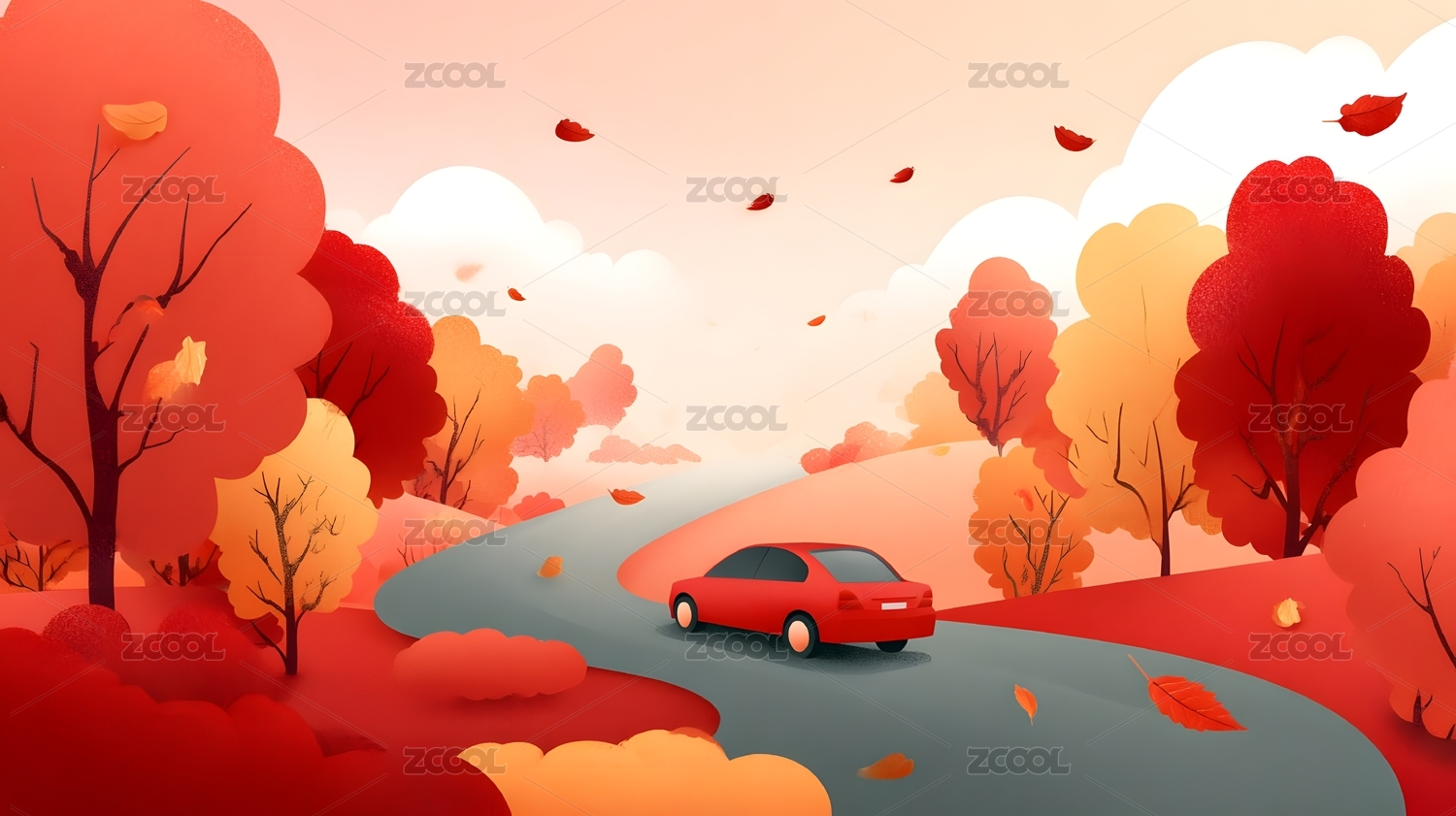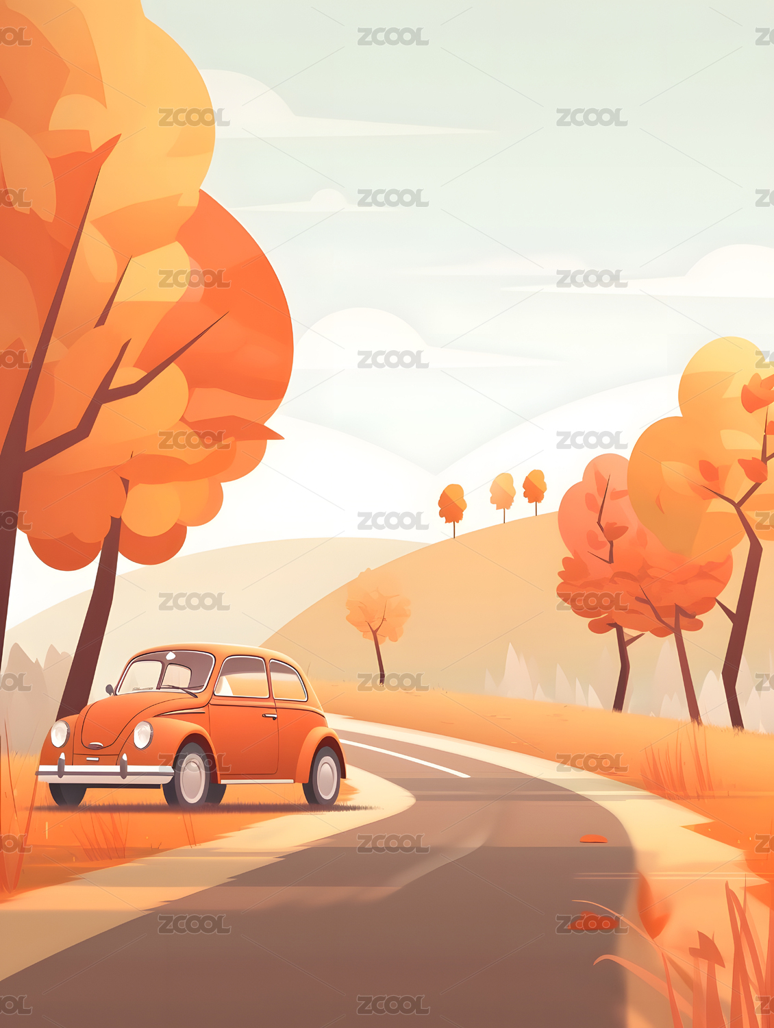 秋冬街道橙色汽车充电加油场景扁平插画素材
