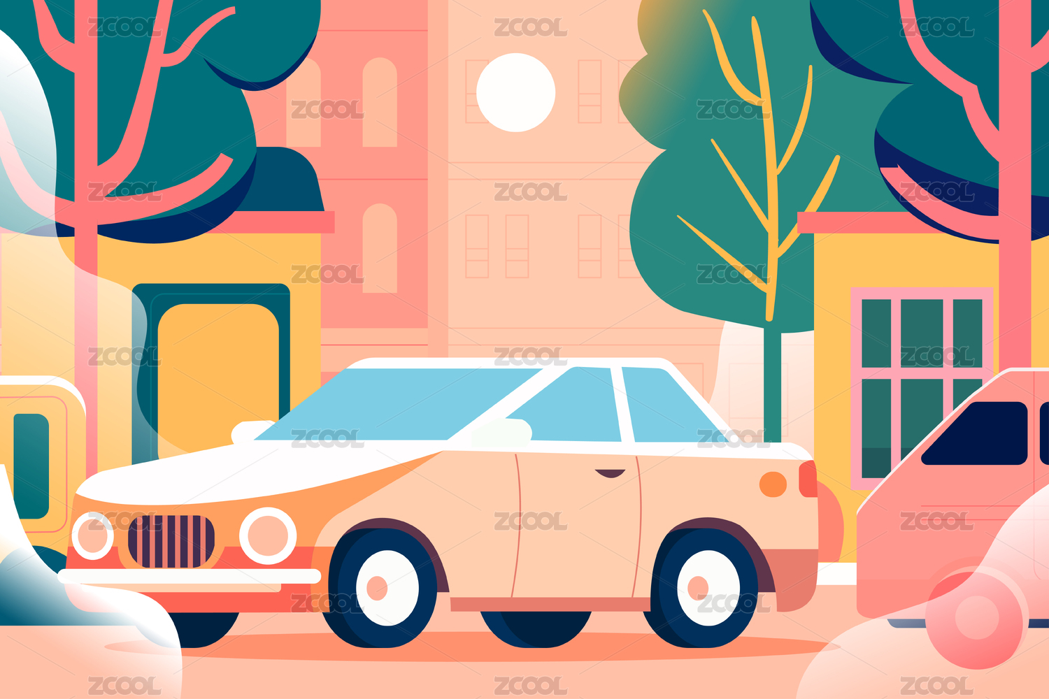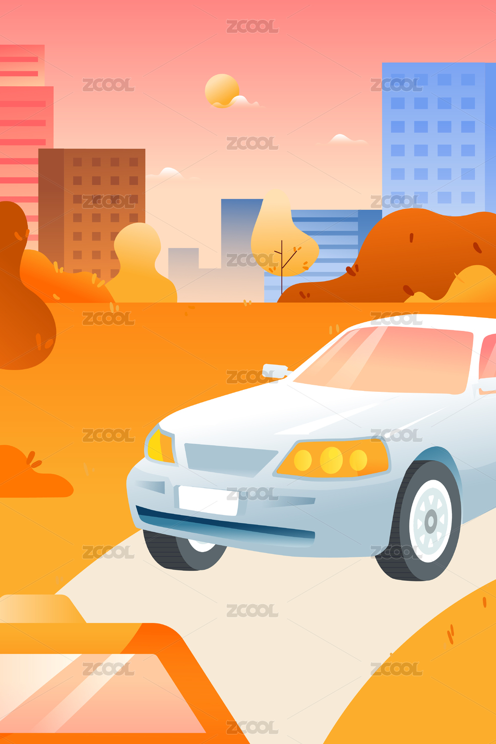童趣插画——高楼背景下一辆黄色小汽去郊游