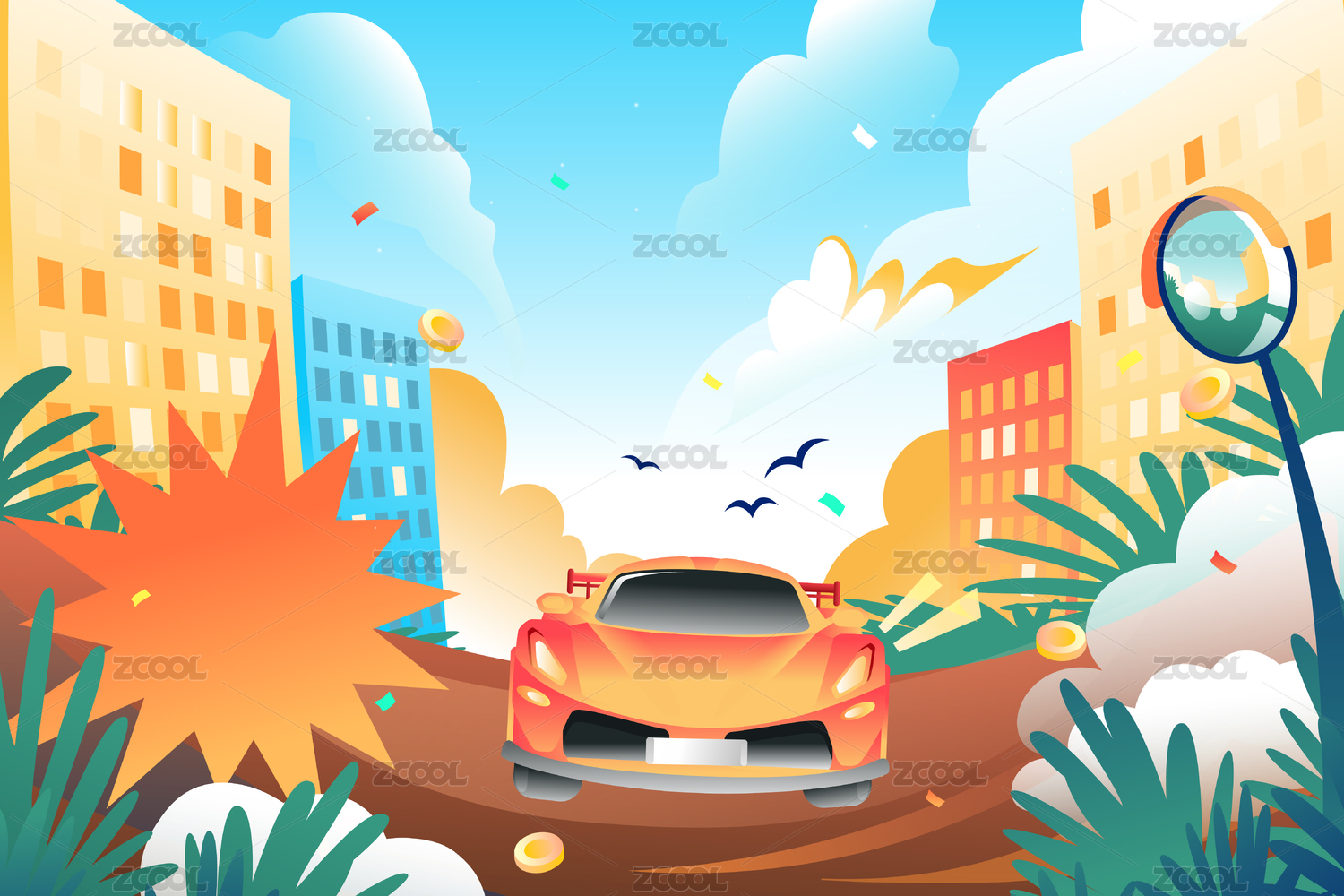 童趣插画——高楼背景下一辆行驶的黄色汽车