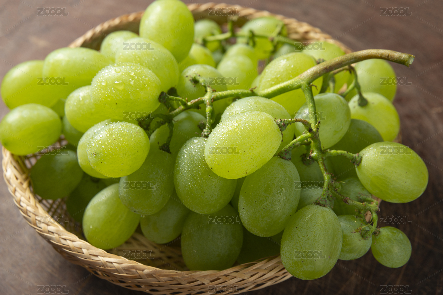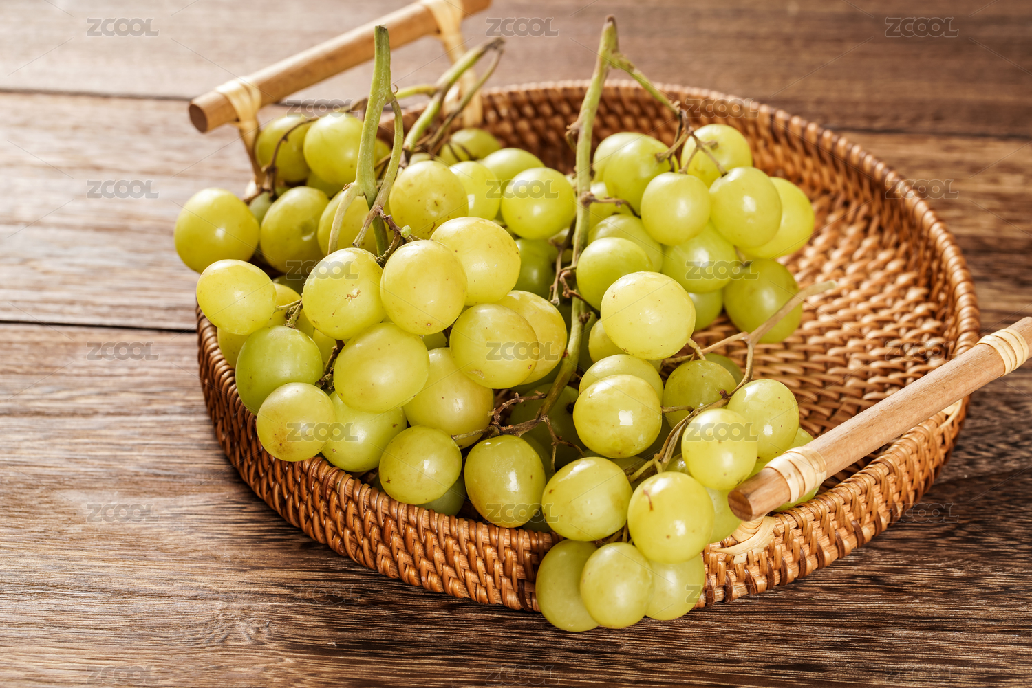 浅灰色的背景中多串绿色葡萄放在水果篮子里