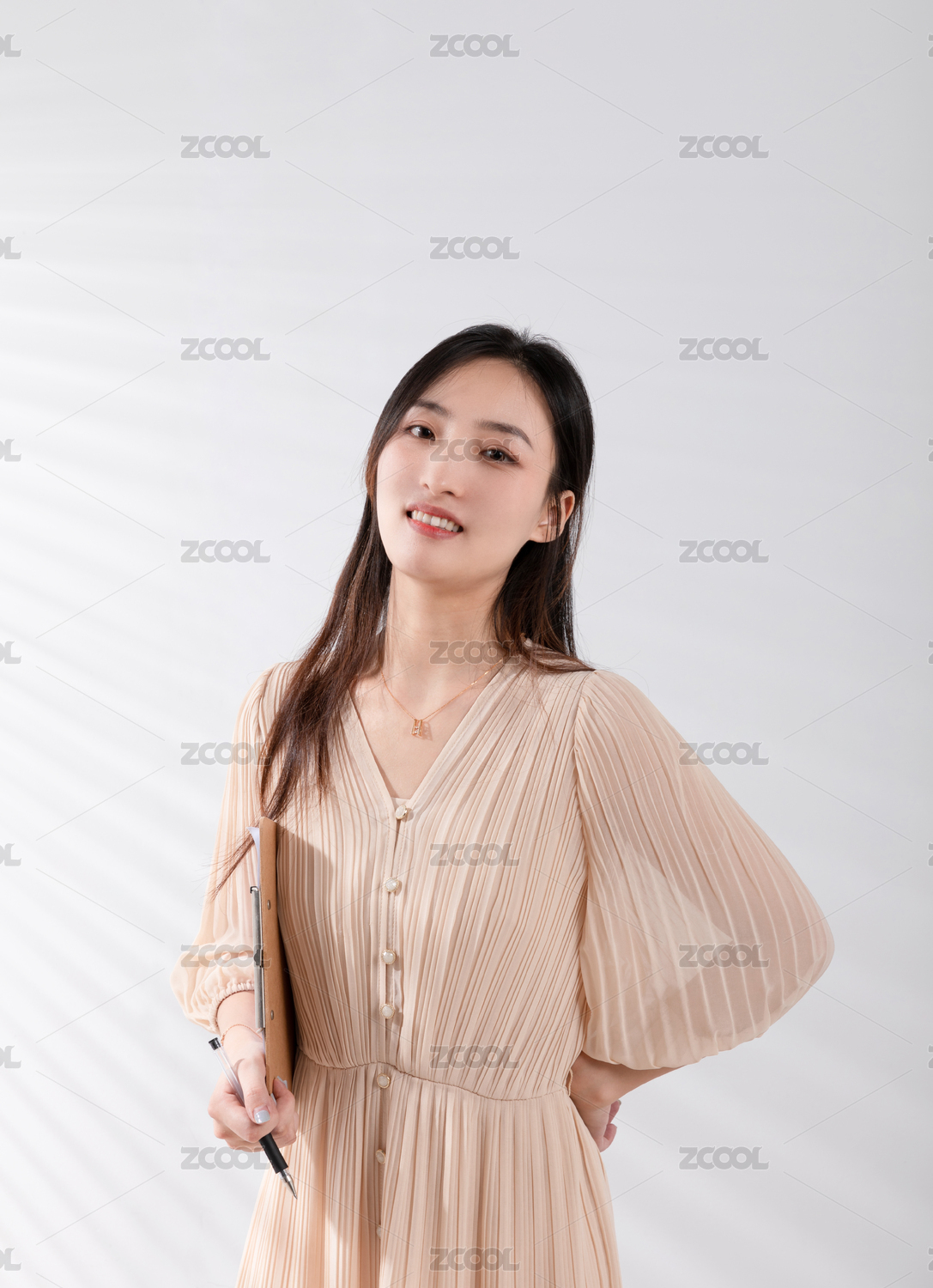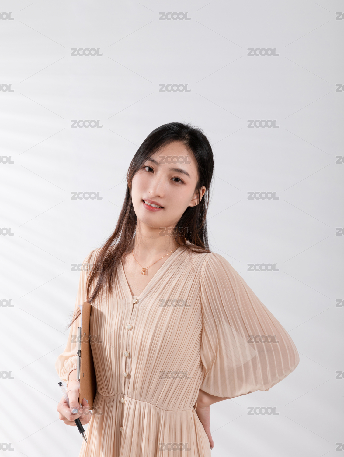 白色光影背景前手拿写字板的美女